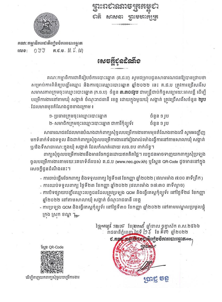 ជូនដំណឹង! គ.ជ.ប ប្រកាសជ្រើសរើសមន្ត្រីជាប់កិច្ចសន្យារយៈពេលខ្លី ៣៣០៤នាក់ ដើម្បីបម្រើការងារនៅតាមឃុំ-សង្កាត់