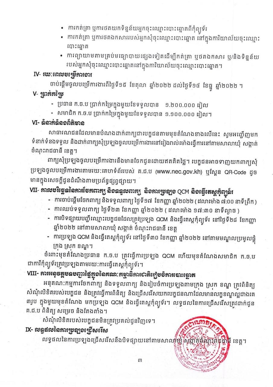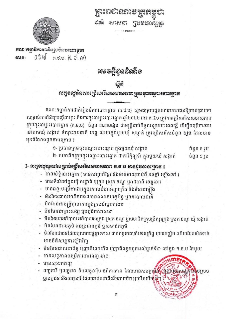បើតាមសេក្តីជូនដំណឹងដែលបណ្តាញព័ត៌មាន Fresh News ទទួលបាននៅថ្ងៃទី១៣ ខែកញ្ញា ឆ្នាំ២០២២នេះ បានបញ្ជាក់ថា ដោយក្នុងមួយឃុំ-សង្កាត់ ត្រូវជ្រើសរើសចំនួន ២រូប ដែលមានមុខតំណែងដូចខាងក្រោម៖