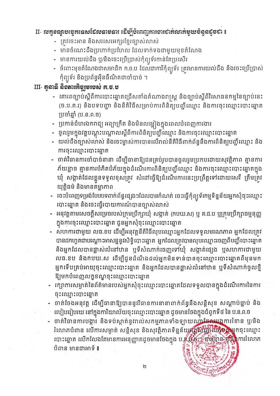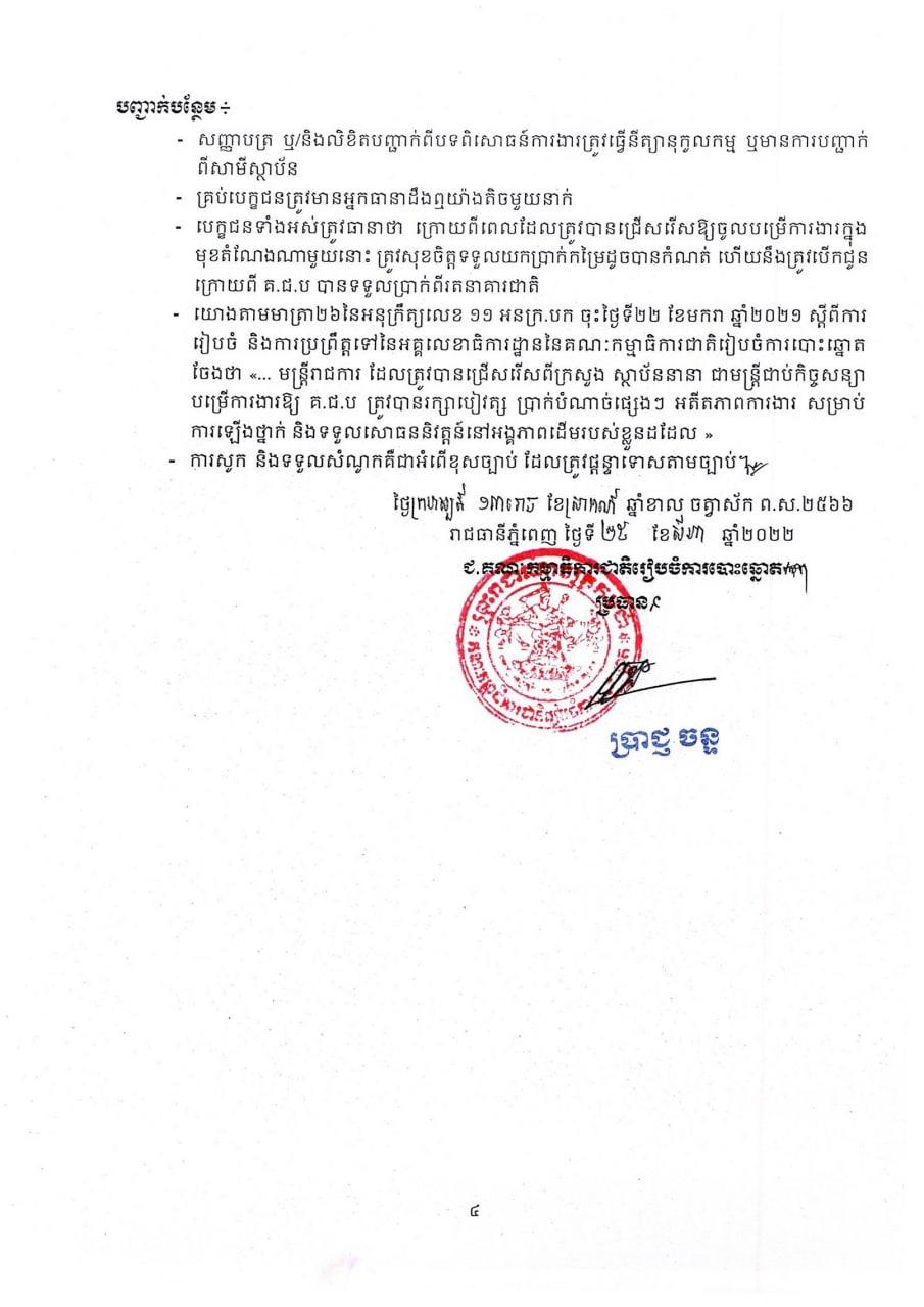 គ.ជ.ប បានឱ្យដឹងថា សាធារណជនដែលមានបំណងដាក់ពាក្យសុំចូលបម្រើការងារតាមមុខតំណែងខាងលើ សូមអញ្ជើញមកទំនាក់ទំនងទទួល និងដាក់ពាក្យសុំចូលបម្រើការងារនៅរៀងរាល់ម៉ោងធ្វើការនៅតាមសាលាឃុំ-សង្កាត់ ឬ/និងទីសាធារណៈក្នុងឃុំ សង្កាត់ ដែលកំណត់ដោយ លធ.ខប ពាក់ព័ន្ធ។ ពាក្យសុំចូលបម្រើការងារនឹងមានចែកជូនដោយឥតគិតថ្លៃ។