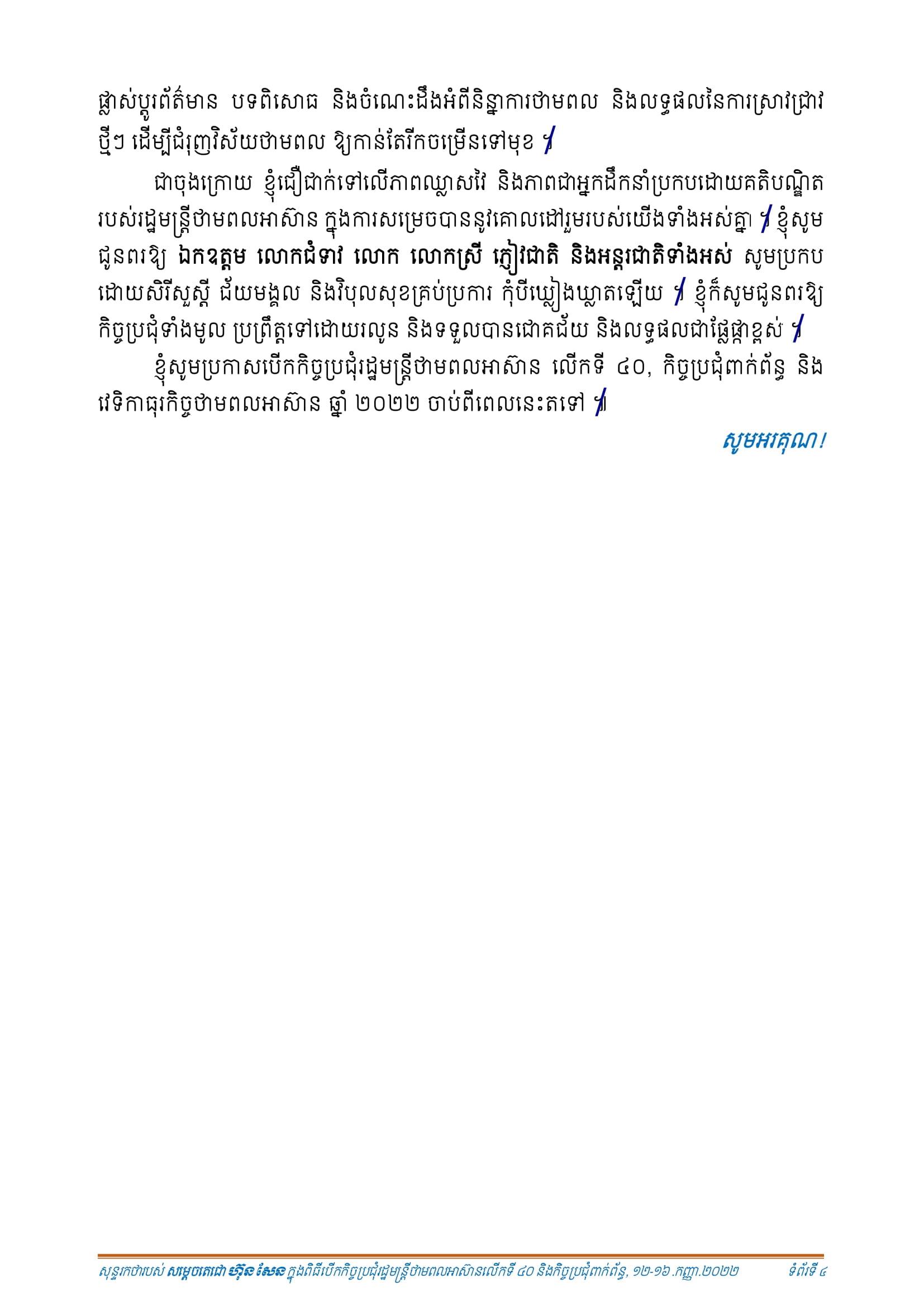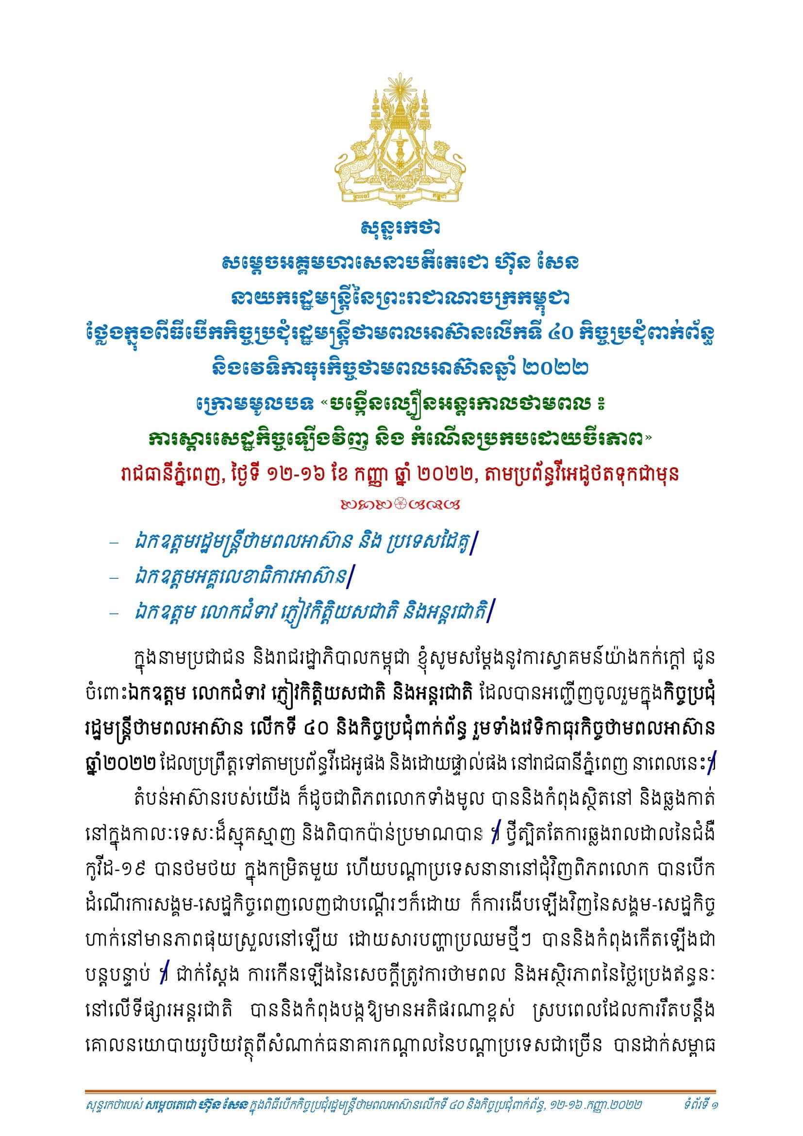 ថ្លែងទៅកាន់ពិធីបើកកិច្ចប្រជុំតាមប្រព័ន្ធវីដេអូ សម្តេចតេជោ ហ៊ុន សែន បានថ្លែងកត់សម្គាល់ថា តំបន់អាស៊ាន ក៏ដូចជាពិភពលោកទាំងមូល បាននិងកំពុងស្ថិតនៅ និងឆ្លងកាត់ក្នុងកាលៈទេសៈដ៏ស្មុគស្មាញ និងពិបាកប៉ាន់ប្រមាណបាន។ ថ្វីដ្បិតតែការឆ្លងរាល ដាល នៃជំងឺកូវីដ-១៩ បានថមថយក្នុងកម្រិតមួយ ហើយបណ្តាប្រទេសនានា នៅជុំវិញពិភព លោក បានបើកដំណើរការសង្គម សេដ្ឋកិច្ចពេញលេញជាបណ្តើរៗក៏ដោយ ក៏ការងើបឡើងវិញ នៃសង្គម សេដ្ឋកិច្ចហាក់នៅមានភាពផុយស្រួលនៅឡើយ ដោយសារបញ្ហាប្រឈមថ្មីៗ បាននិងកំពុងកើតឡើងជាបន្តបន្ទាប់។