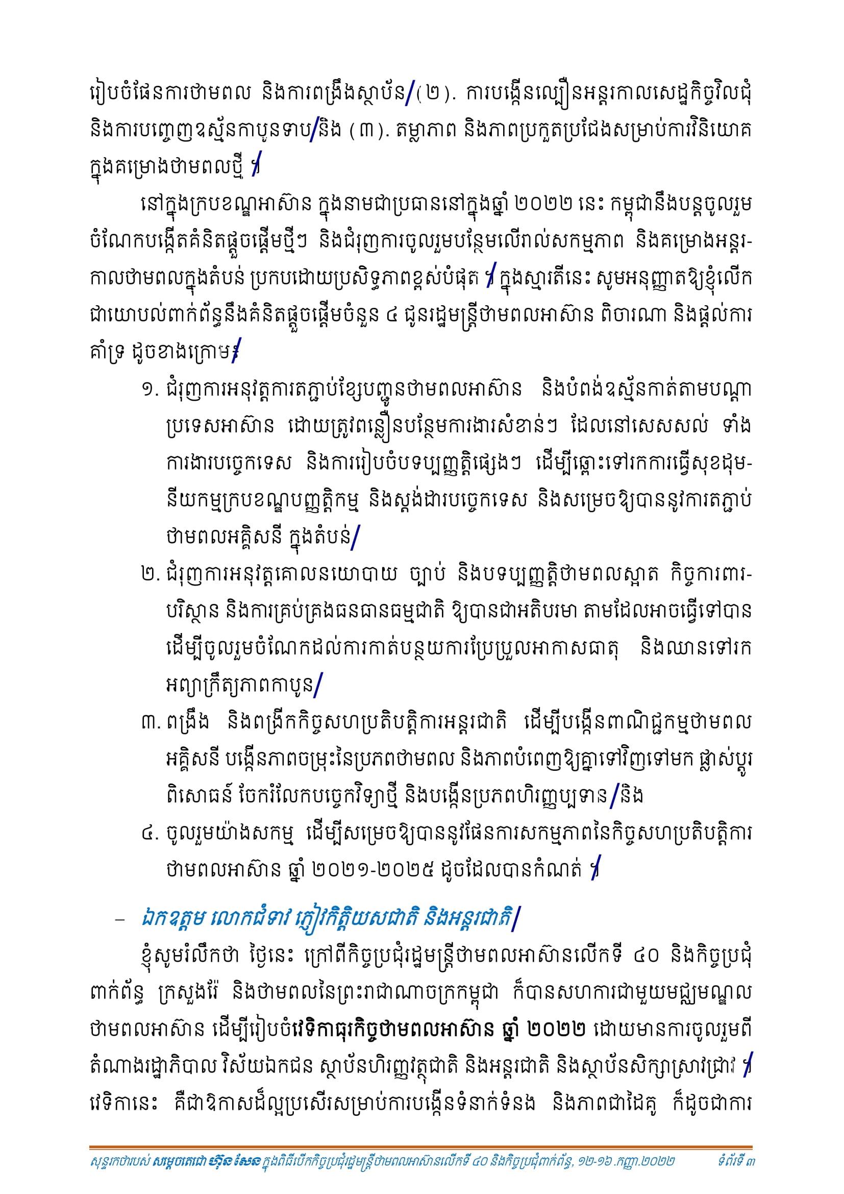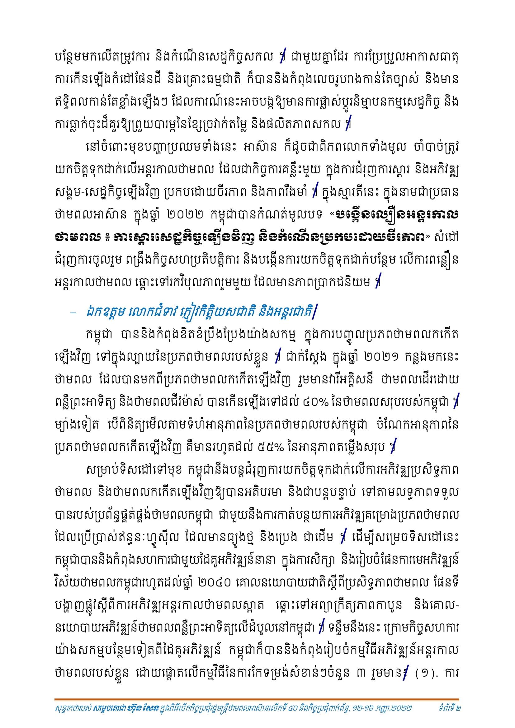 នៅចំពោះមុខបញ្ហាប្រឈមទាំងនេះ សម្តេតេជោ ហ៊ុន សែន ក្នុងនាមជាប្រធានអាស៊ាន បាន លើកឡើងថា អាស៊ាន ក៏ដូចជាពិភពលោកទាំងមូល ចាំបាច់ត្រូវយកចិត្តទុកដាក់លើអន្តរកាល ថាមពល ដែលជាកិច្ចការគន្លឹះមួយ ក្នុងការជំរុញការស្តារ និងអភិវឌ្ឍសង្គម-សេដ្ឋកិច្ចឡើងវិញ ប្រកបដោយចីរភាព និងភាពរឹងមាំ។