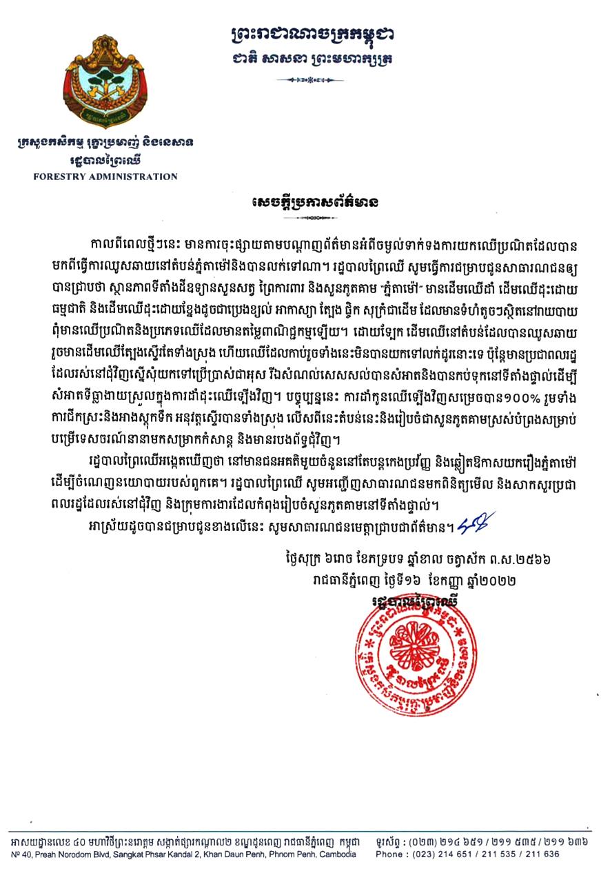 (ភ្នំពេញ)៖ រដ្ឋបាលព្រៃឈើ នៅថ្ងៃទី១៦ ខែកញ្ញា ឆ្នាំ២០២២ បានចេញសេចក្តីប្រកាសព័ត៌មានមួយបញ្ជាក់ថា ដើមឈើដែលត្រូវបានឈូសឆាយ នៅតំបន់ភ្នំតាម៉ៅ មិនត្រូវបានយកទៅលក់ដូរនោះទេ។ នេះបើតាមសេចក្តីប្រកាសព័ត៌មាន ដែលបណ្តាញ Fresh News ទទួលបាន។