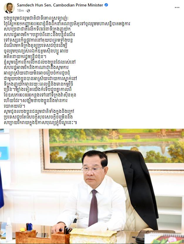 តាមរយៈ Facebook ផ្លូវការសម្តេចតេជោ ហ៊ុន សែន បានបង្ហោះសារមានខ្លឹមសារទាំងស្រុងយ៉ាងដូច្នេះថា «បងប្អូនរួមជនរួមជាតិជាទីគោពស្រឡាញ់! ថ្ងៃស្អែក២១ កញ្ញា ២០២៣ ខ្ញុំនឹងដឹកនាំគណៈប្រតិភូ ទៅចូលរួមមហាសន្និបាតអង្គការ សហប្រជាជាតិលើកទី៧៧ នាទីក្រុងញូយ៉កសហរដ្ឋអាមេរិក។ បន្ទាប់ពីនោះនឹងបន្តដំណើរទៅទស្សនកិច្ចផ្លូវការ នៅគុយបាព្រមទាំងបន្តដំណើរមកទីក្រុងតូត្យូ ប្រទេសជប៉ុន ដើម្បីចូលរួមបុណ្យសព ឯកឧត្តមស៉ីនហ្សូ អាបេ អតីតនាយករដ្ឋមន្ត្រីជប៉ុន។