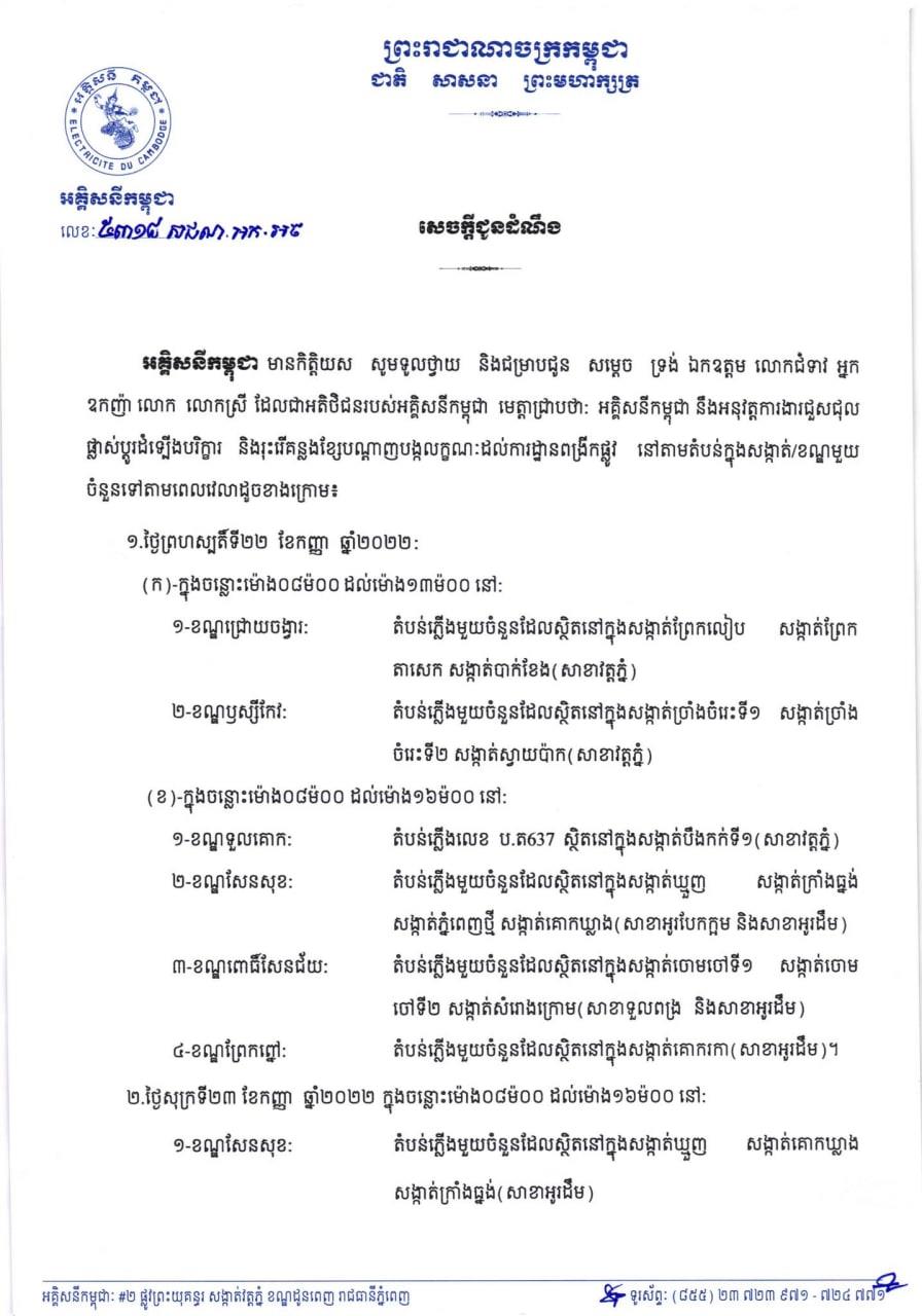 (ភ្នំពេញ)៖ អគ្គិសនីកម្ពុជា (EDC) បានចេញសេចក្តី ជូនដំណឹង ស្តីពីការអនុវត្តការងារជួសជុល ផ្លាស់ប្តូរ តម្លើងបរិក្ខារនានា និងរុះរើគន្លងខ្សែបណ្តាញ អគ្គិសនីរបស់អគ្គិសនីកម្ពុជា ដើម្បីបង្កលក្ខណៈងាយស្រួលដល់ការដ្ឋាន ពង្រីកផ្លូវ នៅថ្ងៃទី២២-២៣ ខែកញ្ញា ឆ្នាំ២០២២ នៅតំបន់មួយចំនួនទៅតាមពេលវេលា និងទីកន្លែងដូចសេចក្តីជូនដំណឹង លម្អិតខាងក្រោម។