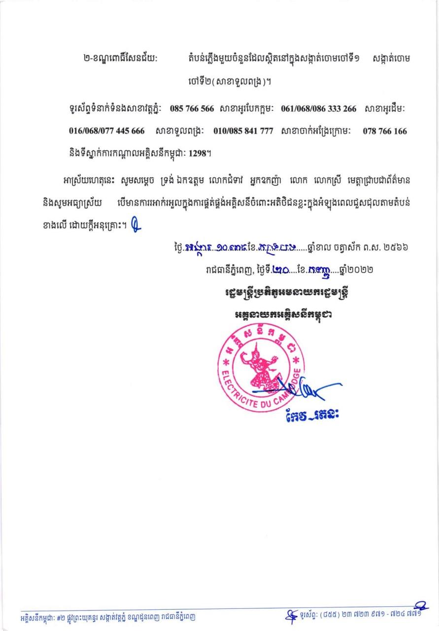 សូមអានសេចក្តីជូនដំណឹង របស់អគ្គិសនីកម្ពុជា ដូចខាងក្រោម៖