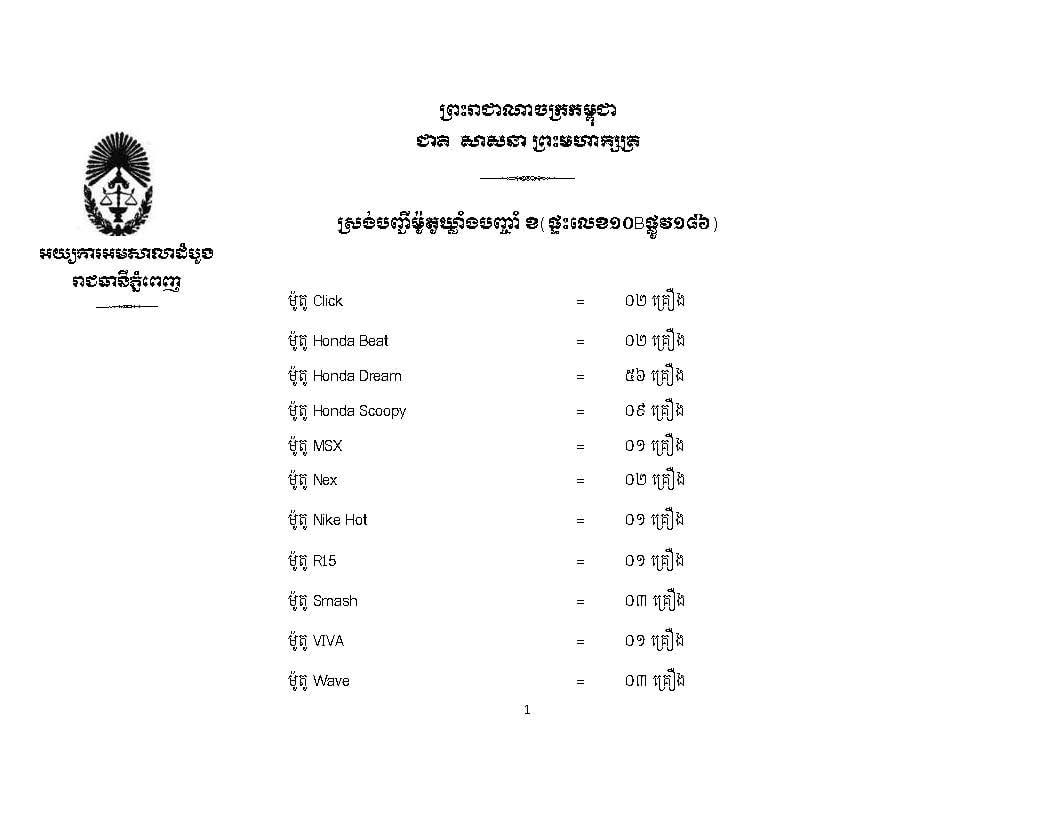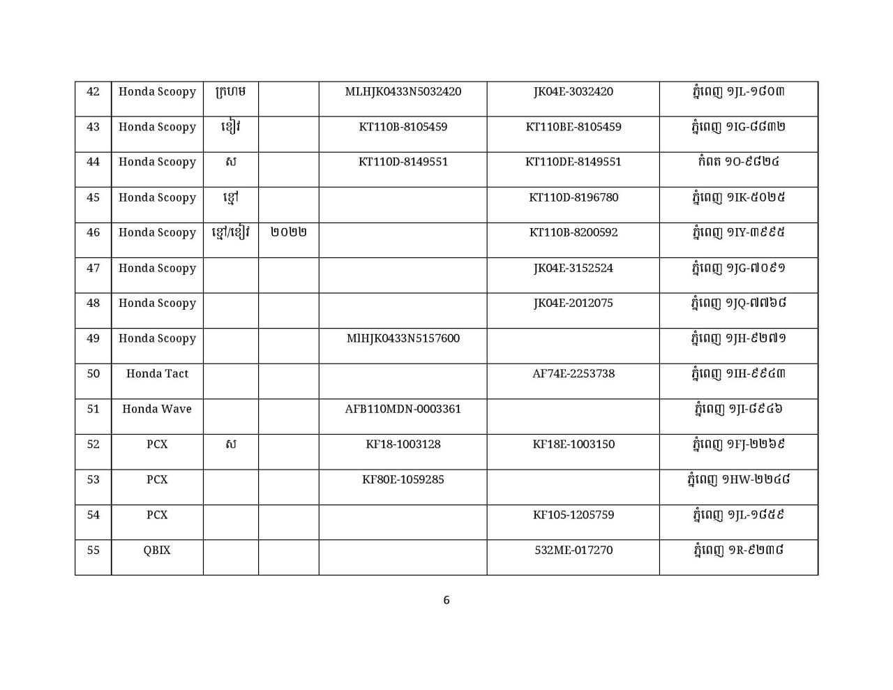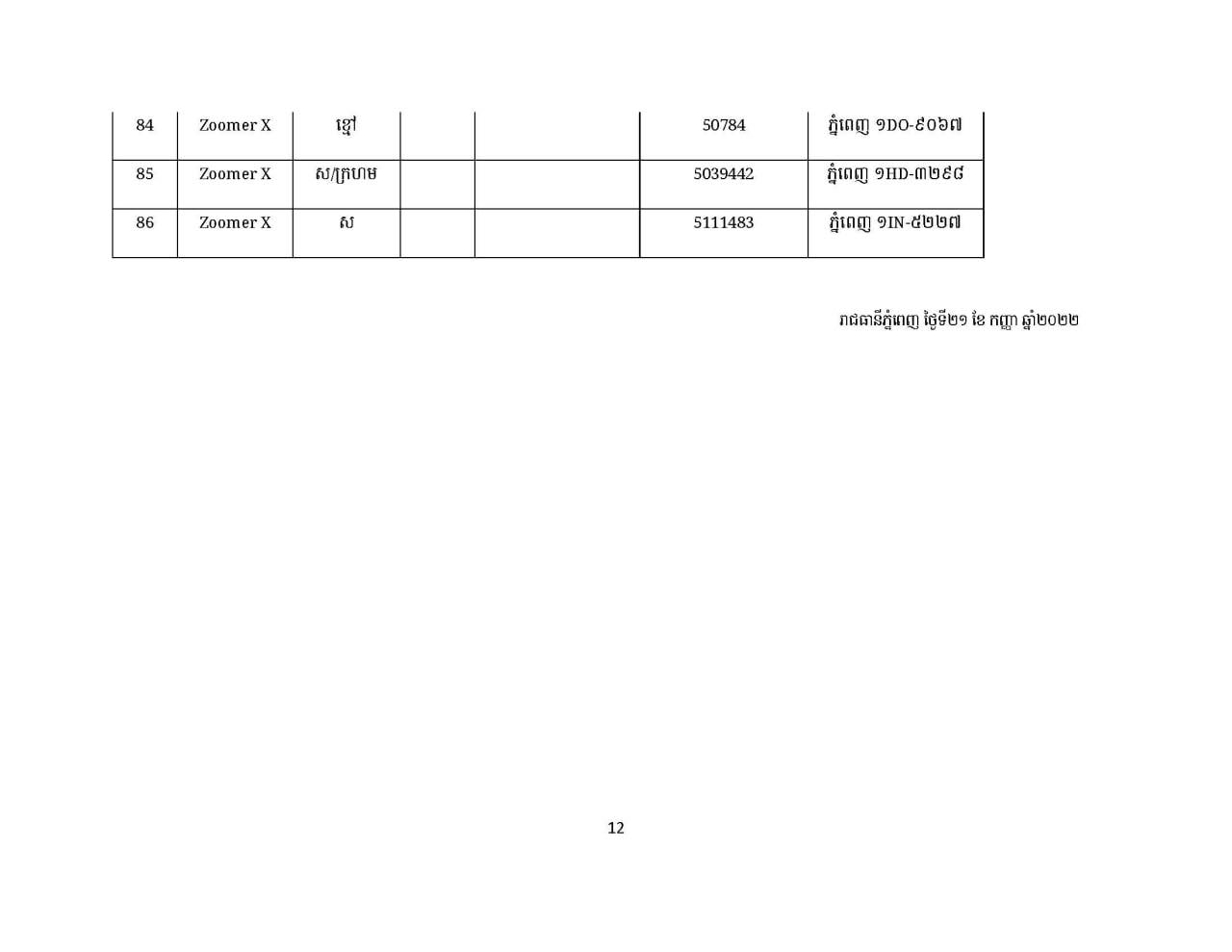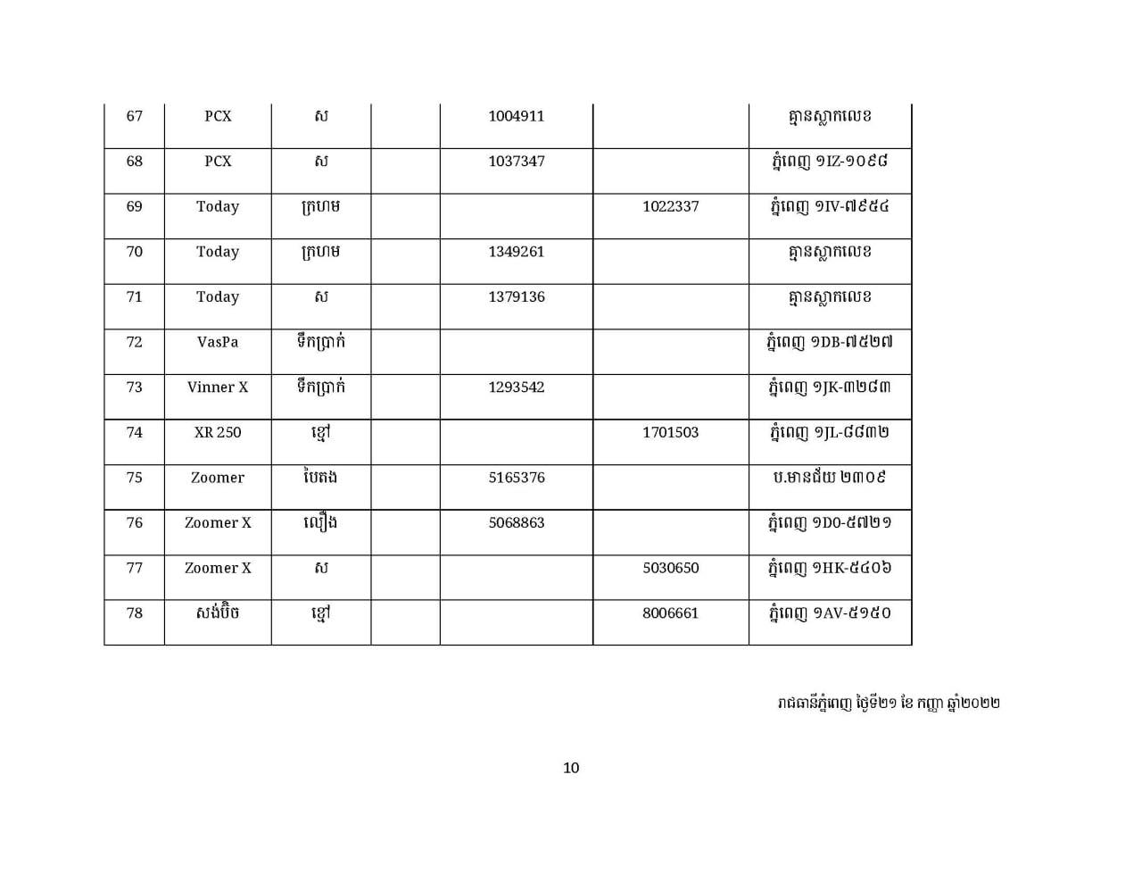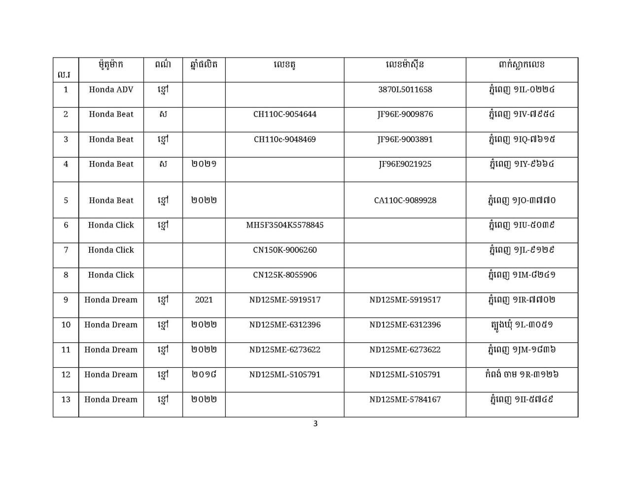 រាជធានីភ្នំពេញ៖ យោងតាមការចុះផ្សាយរបស់ រដ្ឋបាលខណ្ឌជ្រោយចង្វារ នៅថ្ងៃទី២១ ខែកញ្ញា ឆ្នាំ២០២២ បានឱ្យដឹងថា ដើម្បីផ្តល់ភាពងាយស្រួលដល់ក្រុមការងារពិនិត្យផ្ទៀងផ្ទាត់ឯកសារ និងជួយសម្រួលដល់បងប្អូនប្រជាពលរដ្ឋដែលស្វែងរកម៉ូតូ ដូចនេះសូមបងប្អូនពិនិត្យមើលបញ្ជីខាងក្រោមជាមុនសិន។
