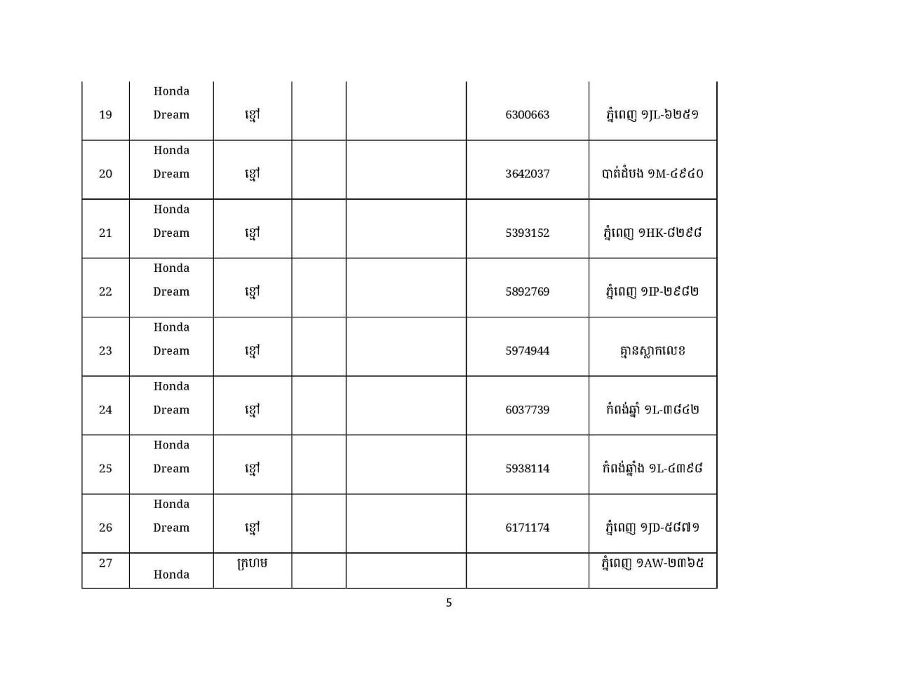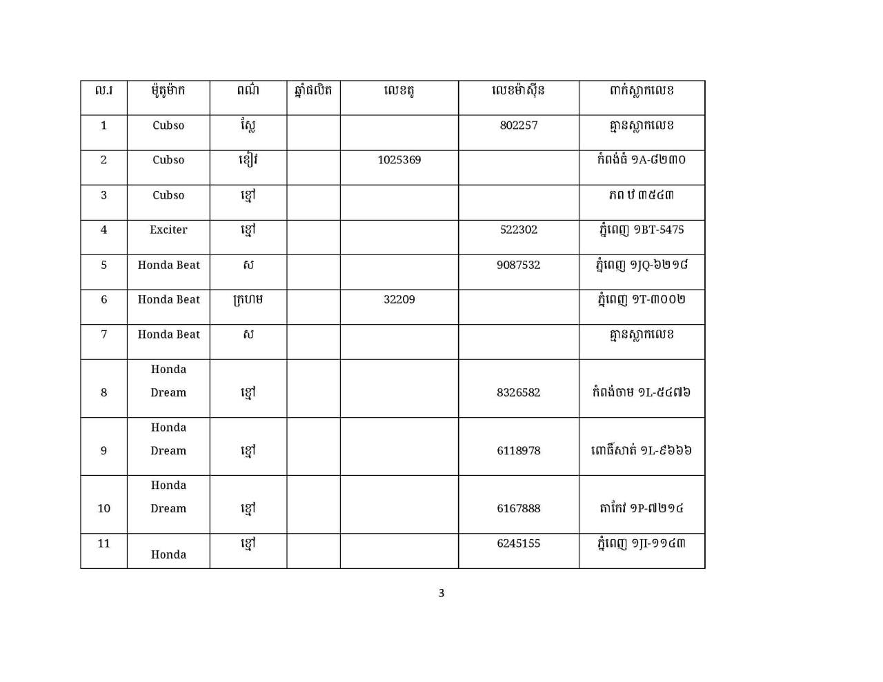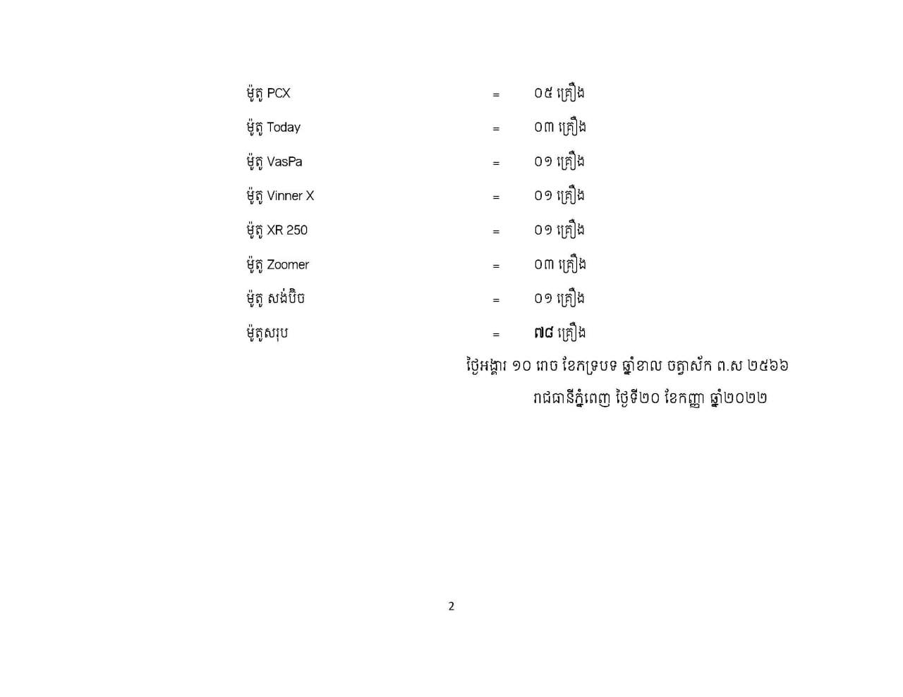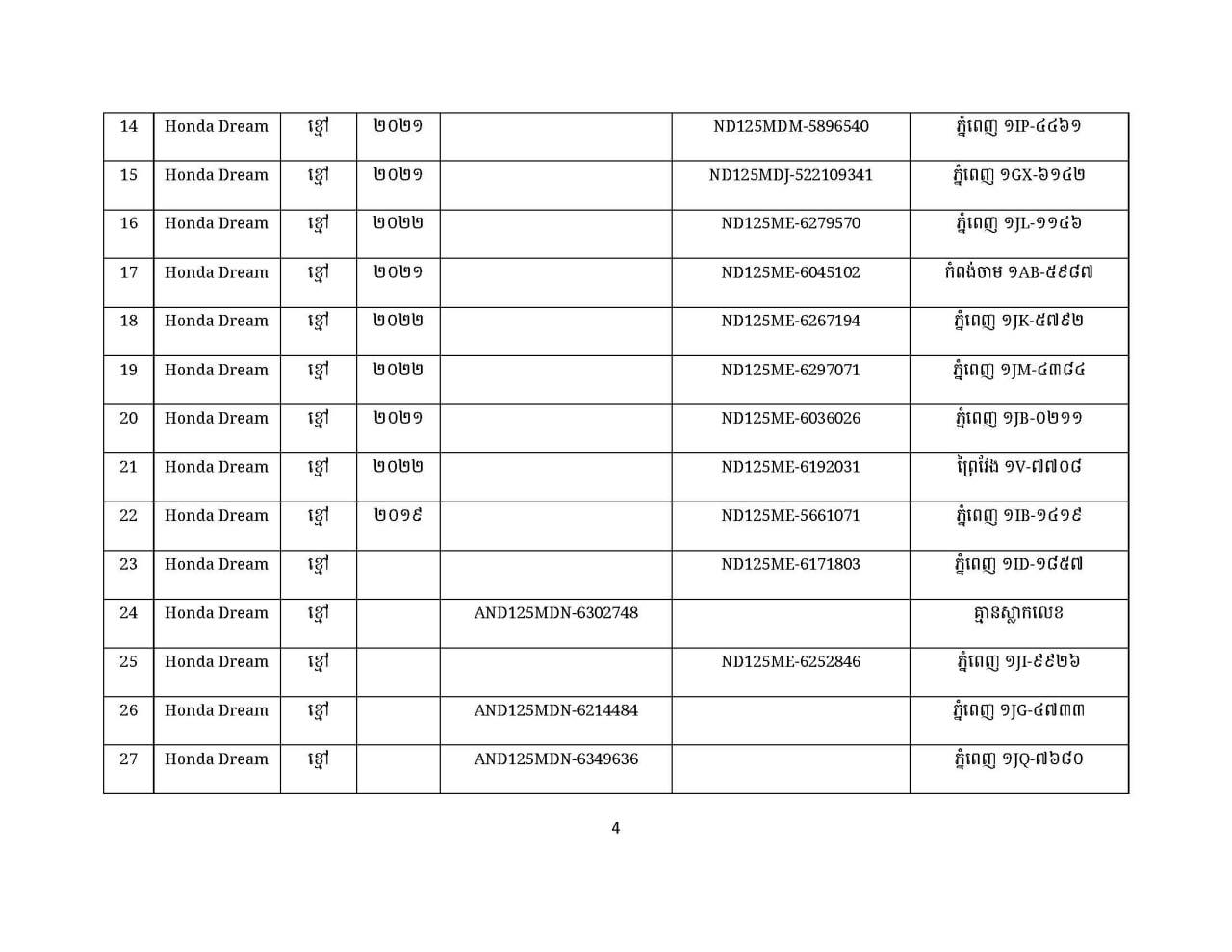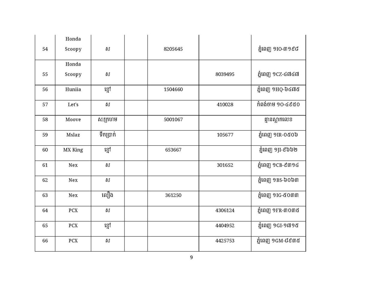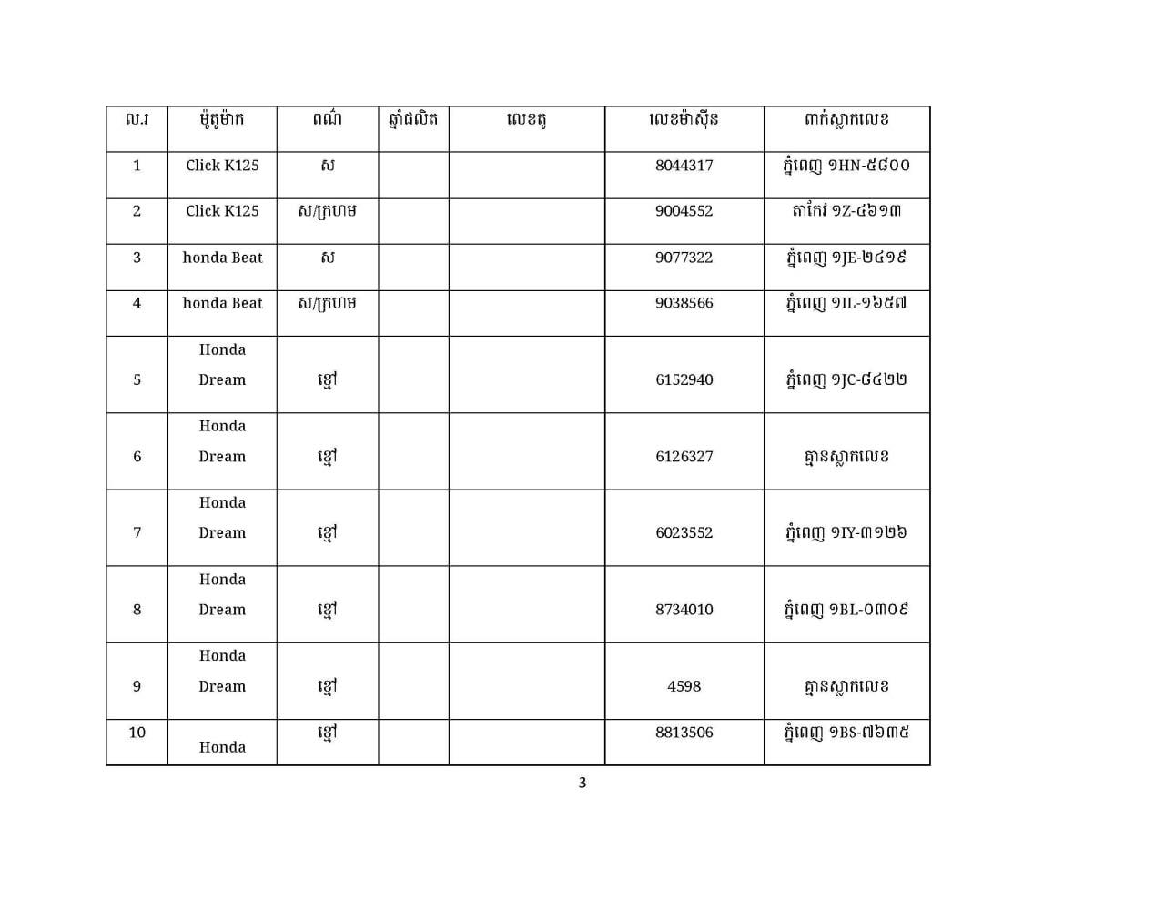 រាជធានីភ្នំពេញ៖ យោងតាមការចុះផ្សាយរបស់ រដ្ឋបាលខណ្ឌជ្រោយចង្វារ នៅថ្ងៃទី២១ ខែកញ្ញា ឆ្នាំ២០២២ បានឱ្យដឹងថា ដើម្បីផ្តល់ភាពងាយស្រួលដល់ក្រុមការងារពិនិត្យផ្ទៀងផ្ទាត់ឯកសារ និងជួយសម្រួលដល់បងប្អូនប្រជាពលរដ្ឋដែលស្វែងរកម៉ូតូ ដូចនេះសូមបងប្អូនពិនិត្យមើលបញ្ជីខាងក្រោមជាមុនសិន។