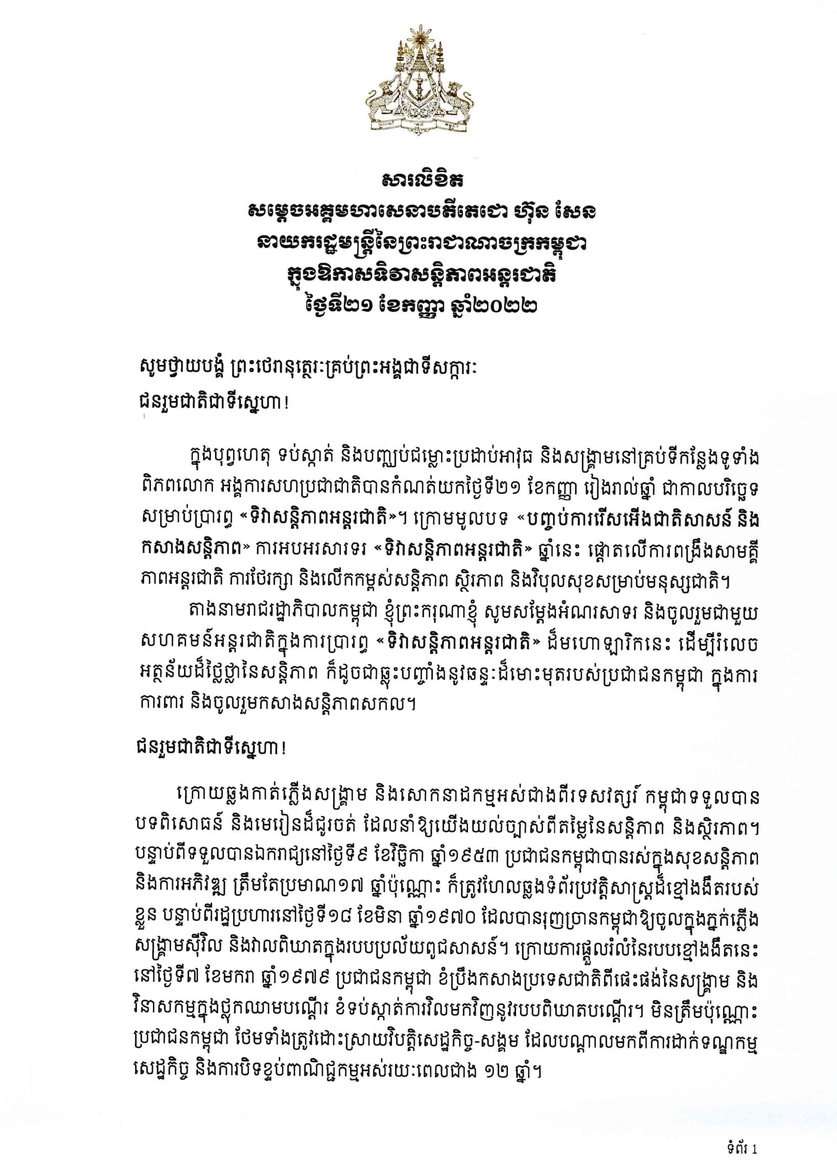 «តាងនាមរាជរដ្ឋាភិបាលកម្ពុជា ខ្ញុំព្រះករុណាខ្ញុំ សូមសម្តែងអំណរសាទរ និងចូលរួមជាមួយសហគមន៍អន្តរជាតិក្នុងការប្រារព្ធ «ទិវាសន្តិភាពអន្តរជាតិ» ដ៏មហោឡារិកនេះ ដើម្បីរំលេចអត្ថន័យដ៏ថ្លៃថ្លានៃសន្តិភាព ក៏ដូចជាឆ្លុះបញ្ចាំងនូវឆន្ទៈដ៏មោះមុតរបស់ប្រជាជនកម្ពុជា ក្នុងការការពារ និងចូលរួមកសាងសន្តិភាពសកល»។ នេះបើតាមការគូសបញ្ជាក់របស់ សម្តេចតេជោ ហ៊ុន សែន៕ ផ្តល់សិទ្ធិដោយ៖ freshnews