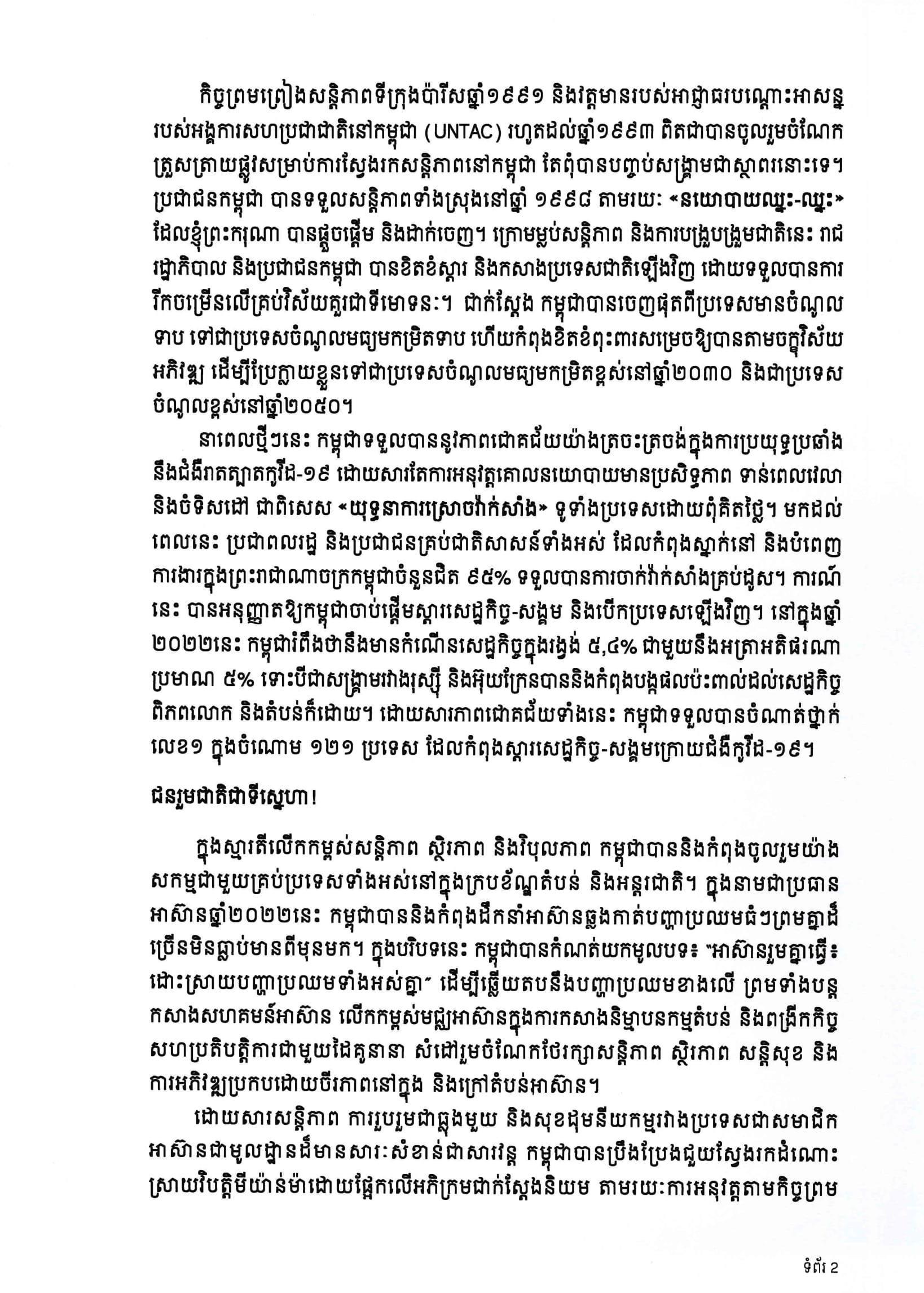 សារលិខិតដែលបណ្តាញព័ត៌មាន Fresh News ទទួលបានបញ្ជាក់យ៉ាងដូច្នេះថា «ក្រោមឆត្ររបស់អង្គការសហប្រជាជាតិ កម្ពុជាបាននិងកំពុងចូលរួមចំណែកយ៉ាងសកម្មក្នុងកិច្ចសហប្រតិបត្តិការថែរក្សាសន្តិភាពពិភពលោក។ ចាប់ពីឆ្នាំ២០០៦ ដល់ឆ្នាំ២០២២ កម្ពុជាបានបញ្ជូនកងកម្លាំងសរុបចំនួន ៨,៣០២នាក់ (ក្នុងនោះ ស្ត្រី៥៨០នាក់) ទៅបំពេញបេសកកម្មថែរក្សាសន្តិភាពរបស់អង្គការសហប្រជាជាតិក្នុងប្រទេសចំនួន០៩ រួមមាន៖ ឆាដ ស៊ូដង់ ស៊ូដង់ខាងត្បូង អាហ្វ្រិកកណ្តាល លីបង់ ស៊ីប ស៊ីរី ម៉ាលី និងយេម៉ែន»។
