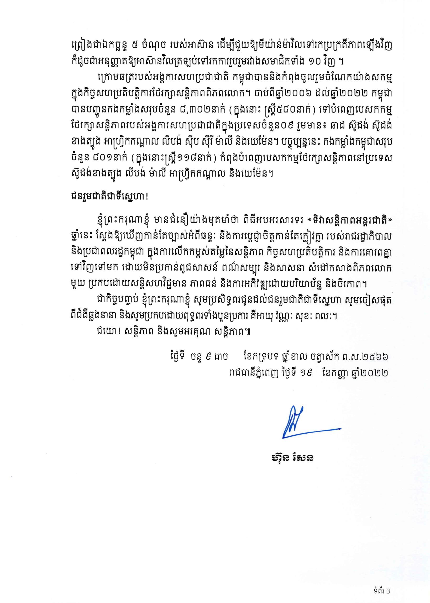 (ភ្នំពេញ)៖ គិតចាប់តាំងពីឆ្នាំ២០០៦មក កម្ពុជាបានបញ្ជូនកងកម្លាំងជាង ៨ពាន់នាក់ហើយ ទៅបំពេញបេសកកម្មថែរក្សាសន្តិភាព របស់អង្គការសហប្រជាជាតិ។ នេះបើយោងតាមសារលិខិត សម្តេចតេជោ ហ៊ុន សែន នាយករដ្ឋមន្ត្រីកម្ពុជា ក្នុងឱកាសទិវាសន្តិភាពអន្តរជាតិ នៅថ្ងៃទី២១ ខែកញ្ញា ឆ្នាំ២០២២។