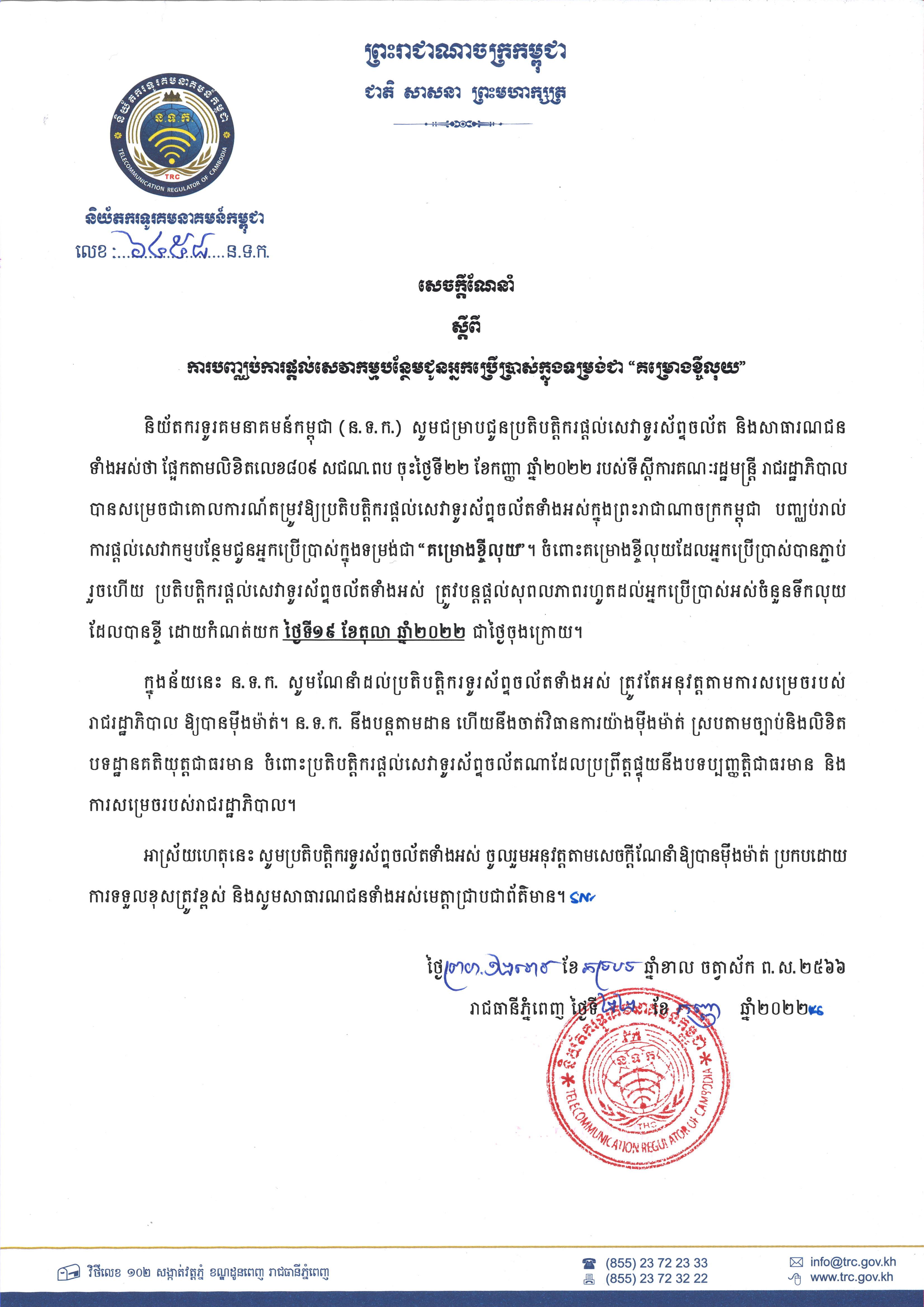 (ភ្នំពេញ)៖ និយ័តករទូរគមនាគមន៍កម្ពុជា (ន.ទ.ក.) បានចេញសេចក្តីប្រកាសមួយបញ្ជាក់ថា ផ្អែកតាមលិខិតលេខ៨០៩ សជណ.ពប ចុះថ្ងៃទី២២ ខែកញ្ញា ឆ្នាំ២០២២ របស់ទីស្តីការគណៈរដ្ឋមន្ត្រី រាជរដ្ឋាភិបាលបានសម្រេចជាគោលការណ៍តម្រូវឱ្យប្រតិបត្តិករផ្តល់សេវាទូរស័ព្ទចល័តទាំងអស់ក្នុងព្រះរាជាណាចក្រកម្ពុជា បញ្ឈប់រាល់ការផ្តល់សេវាកម្មបន្ថែមជូនអ្នកប្រើប្រាស់ក្នុងទម្រង់ជា «គម្រោងខ្ចីលុយ»។