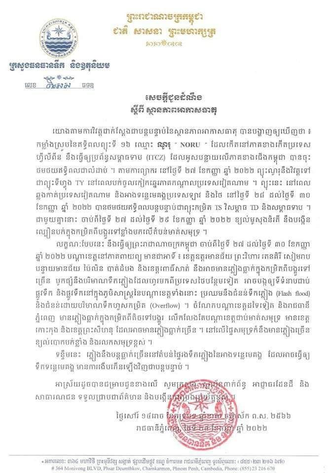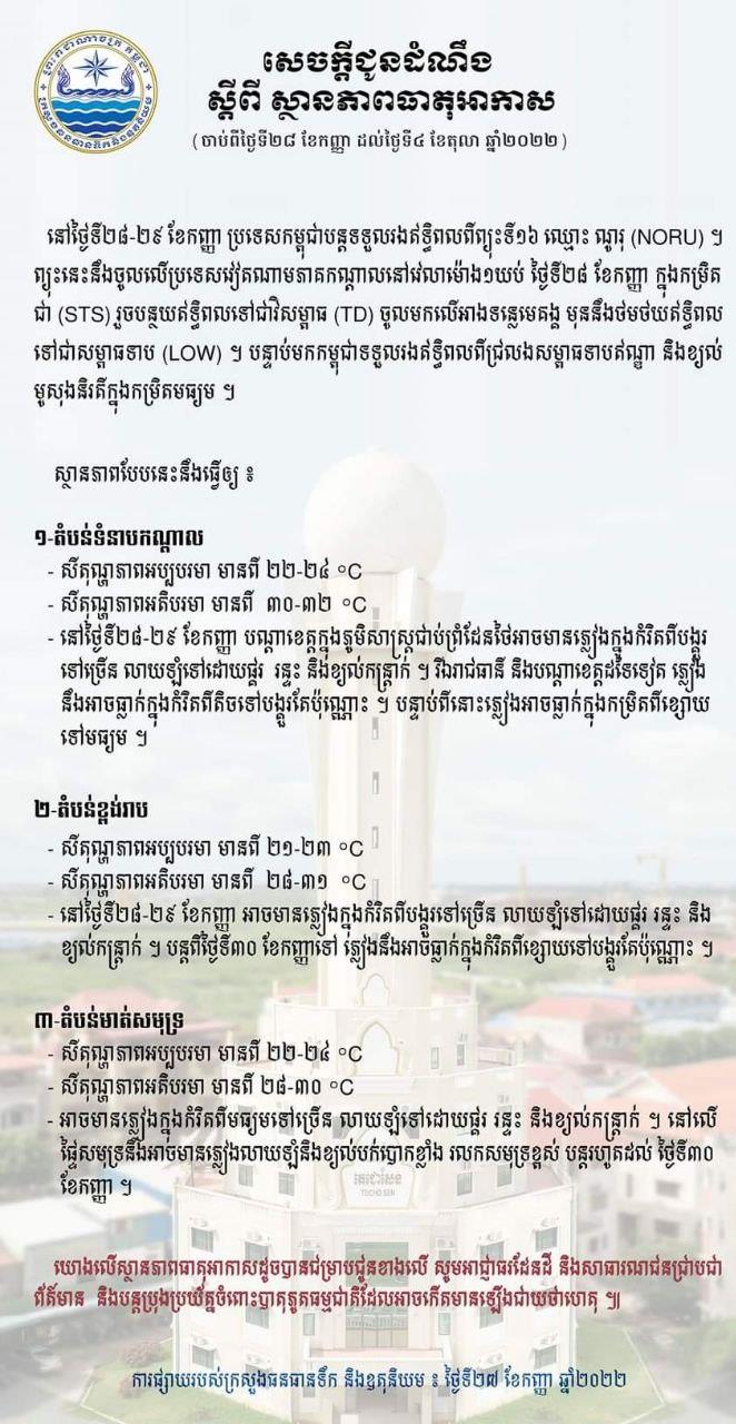 ក្នុងសេចក្តីប្រកាសព័ត៌មានធ្វើឡើងនៅព្រឹកថ្ងៃទី២៧ ខែកញ្ញា ឆ្នាំ២០២២នេះ ក្រសួងធនធានទឹក និងឧតុនិយម បានឱ្យដឹងថា យោងតាមការវិវត្តជាក់ស្ដែងជាបន្តបន្ទាប់នៃស្ថានភាពអាកាសធាតុ បានបង្ហាញឱ្យឃើញថា កម្លាំងស្រូបនៃឥទ្ធិពលព្យុះទី១៦ ឈ្មោះ ណូរុ (NORU) ដែលកើតនៅភាគខាងកើតប្រទេសហ្វីលីពីន នឹងធ្វើឱ្យប្រព័ន្ធសម្ពាធទាប (ITCZ) ដែលអូសបន្លាយលើភាគខាងជើងកម្ពុជា បានចុះថមថយឥទ្ធិពលជាលំដាប់។ តាមការព្យាករ នៅថ្ងៃទី ២៧ ខែកញ្ញា ឆ្នាំ២០២២ ព្យុះណូរុ នឹងវិវត្តទៅជាព្យុះទីហ្វុង TY នៅពេលបក់ចូលកៀកឆ្នេរភាគកណ្តាលប្រទេសវៀតណាម។