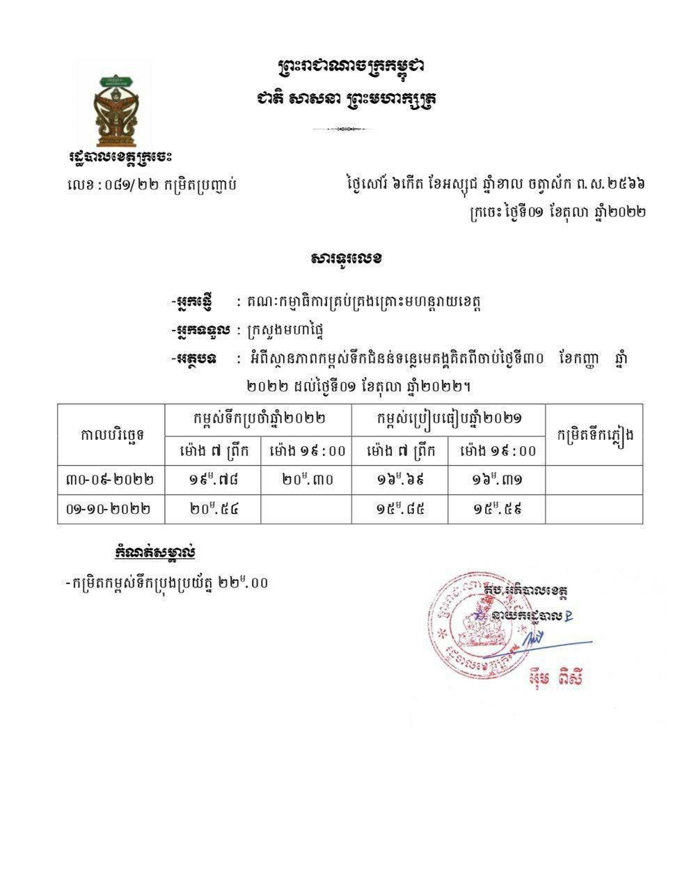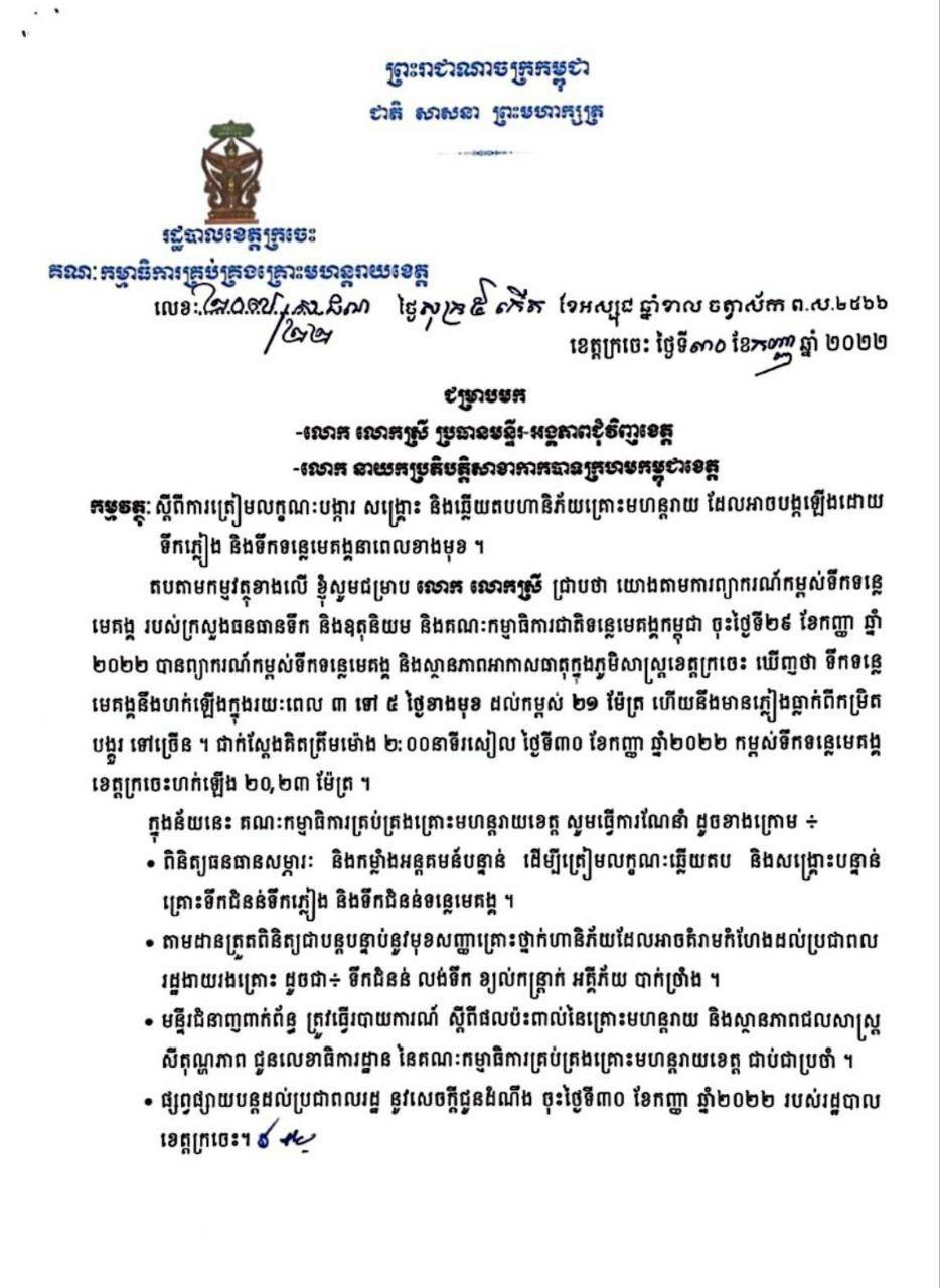 ជាក់ស្ដែងគិតត្រឹមម៉ោង ២រសៀលថ្ងៃទី៣០ ខែកញ្ញា ឆ្នាំ២០២២ កម្ពស់ទឹកទន្លេមេគង្គ ខេត្តក្រចេះហក់ឡើង ២០,២៣ម៉ែត្រ ហើយនៅព្រឹកថ្ងៃទី១ ខែតុលា ឆ្នាំ២០២២ កម្ពស់ទឹកទន្លេមេគង្គហក់ឡើងដល់ ២០,៥៤ម៉ែត្រ។