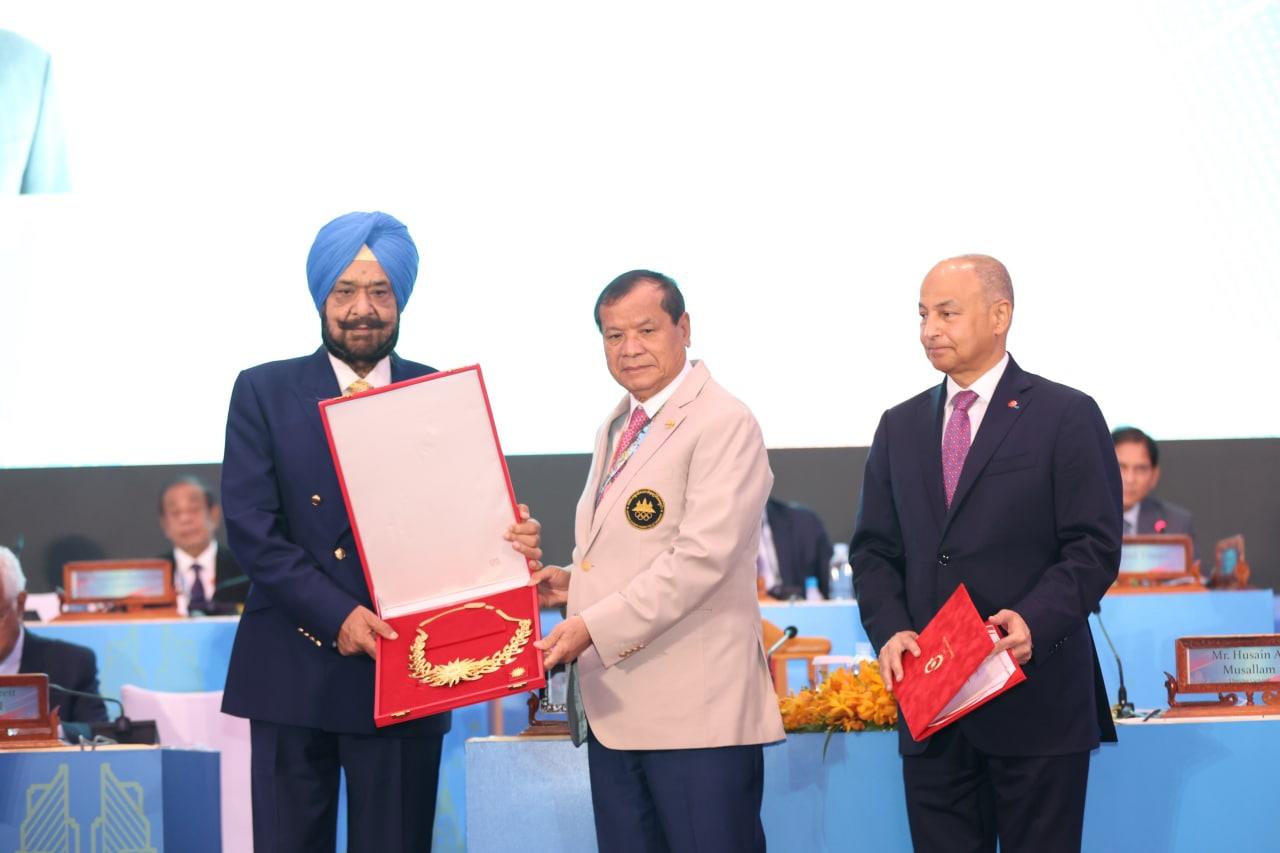 គ្រឿងឥស្សរិយយសថ្នាក់ខ្ពស់នេះ ប្រគល់ដោយលោក Raja Randhir Singh ប្រធានស្ដីទី OCA ដែលធ្វើឡើងក្រោមពិធីបើកមហាសន្និបាត OCA លើកទី៤១ នៅសណ្ឋាគារសុខារ៉េស៊ីដង់ ដែលធ្វើឡើងក្រោមអធិបតីភាពដ៏ខ្ពង់ខ្ពស់របស់សម្ដេចតេជោ ហ៊ុន សែន នាយករដ្ឋមន្ដ្រីនៃកម្ពុជា នៅព្រឹកថ្ងៃទី០៤ ខែតុលា ឆ្នាំ២០២២ នេះ។