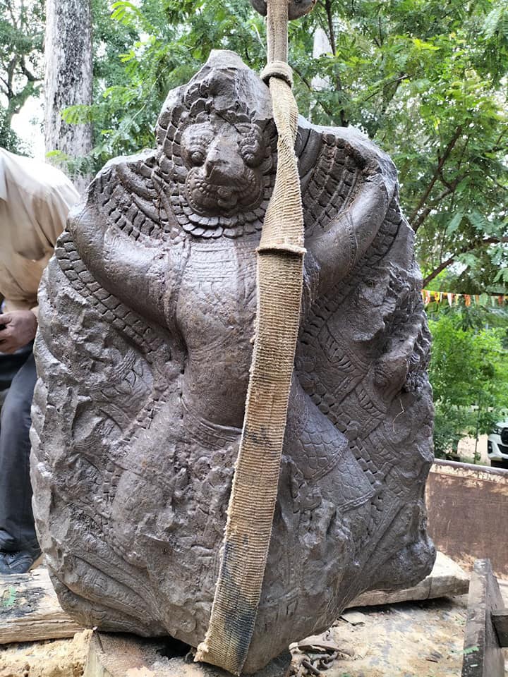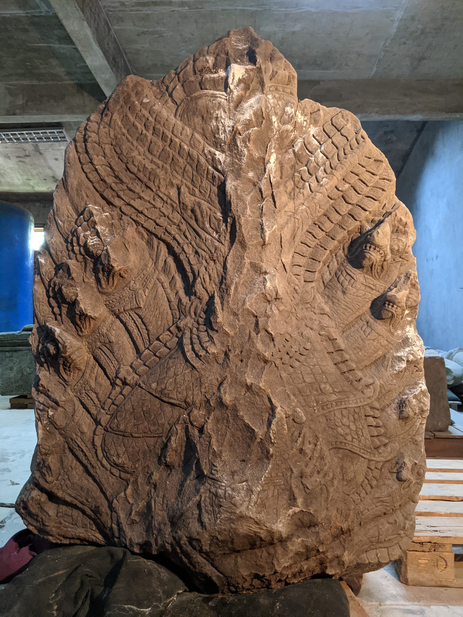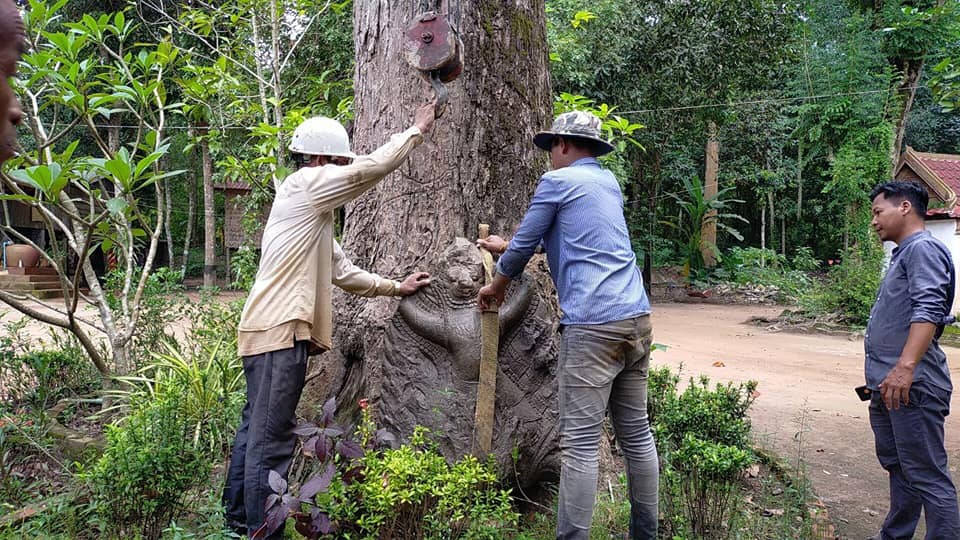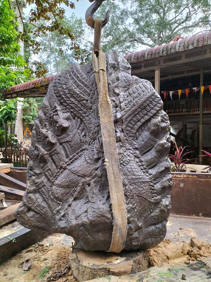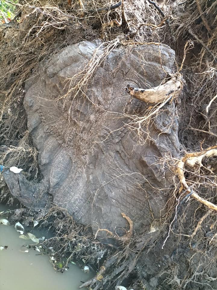 លោក ឈូក សុម៉ាឡា ប្រធានក្រុមចុះបញ្ជីវត្ថុសិល្បៈ នាយកដ្ឋានអភិរក្សប្រាសាទ និងបុរាណវិទ្យា នៃអាជ្ញាធរជាតិអប្សរាបានឱ្យដឹងថា បំណែកក្បាលនាគនេះ បានកប់ក្នុងដីជម្រៅប្រមាណកន្លះម៉ែត្រ ហើយជាក់ស្តែង ដើមស្រឡៅដែលដុះពីលើមិនមានឬសកែវធំៗ ទើបពេលភ្លៀងជោគជាំ ដីជ្រាយ ធ្វើឱ្យដួលរលំ និងផុសក្បាលនាគដែលឬសឈើដុះចាក់ស្រេះមកជាមួយតែម្តង។