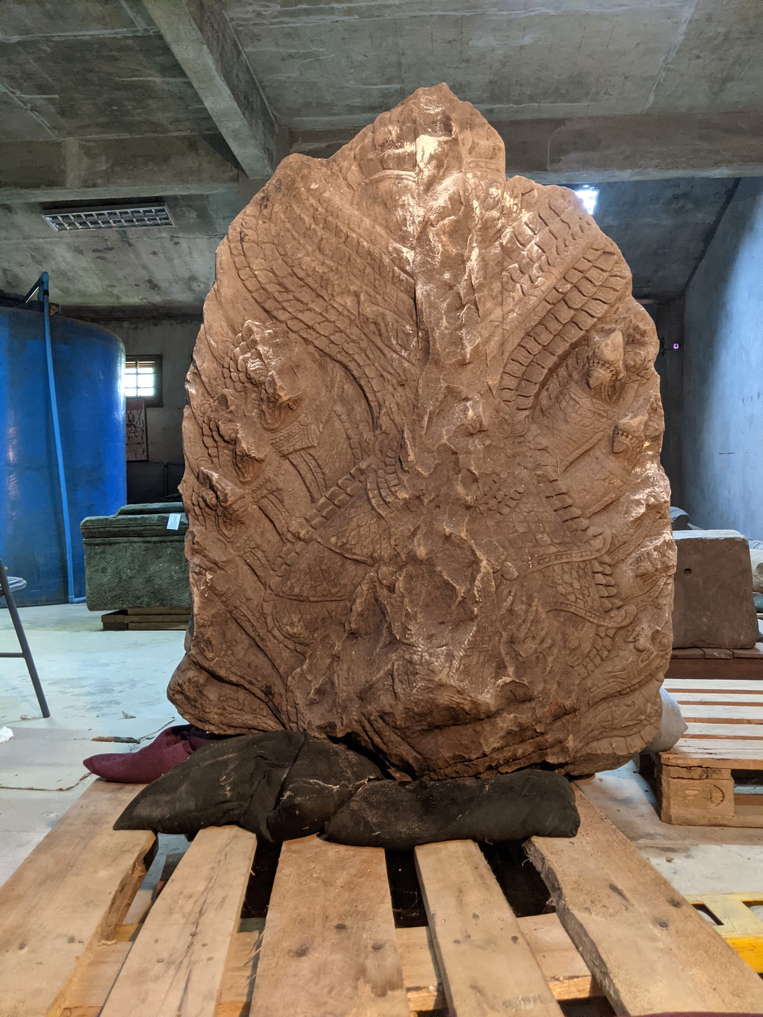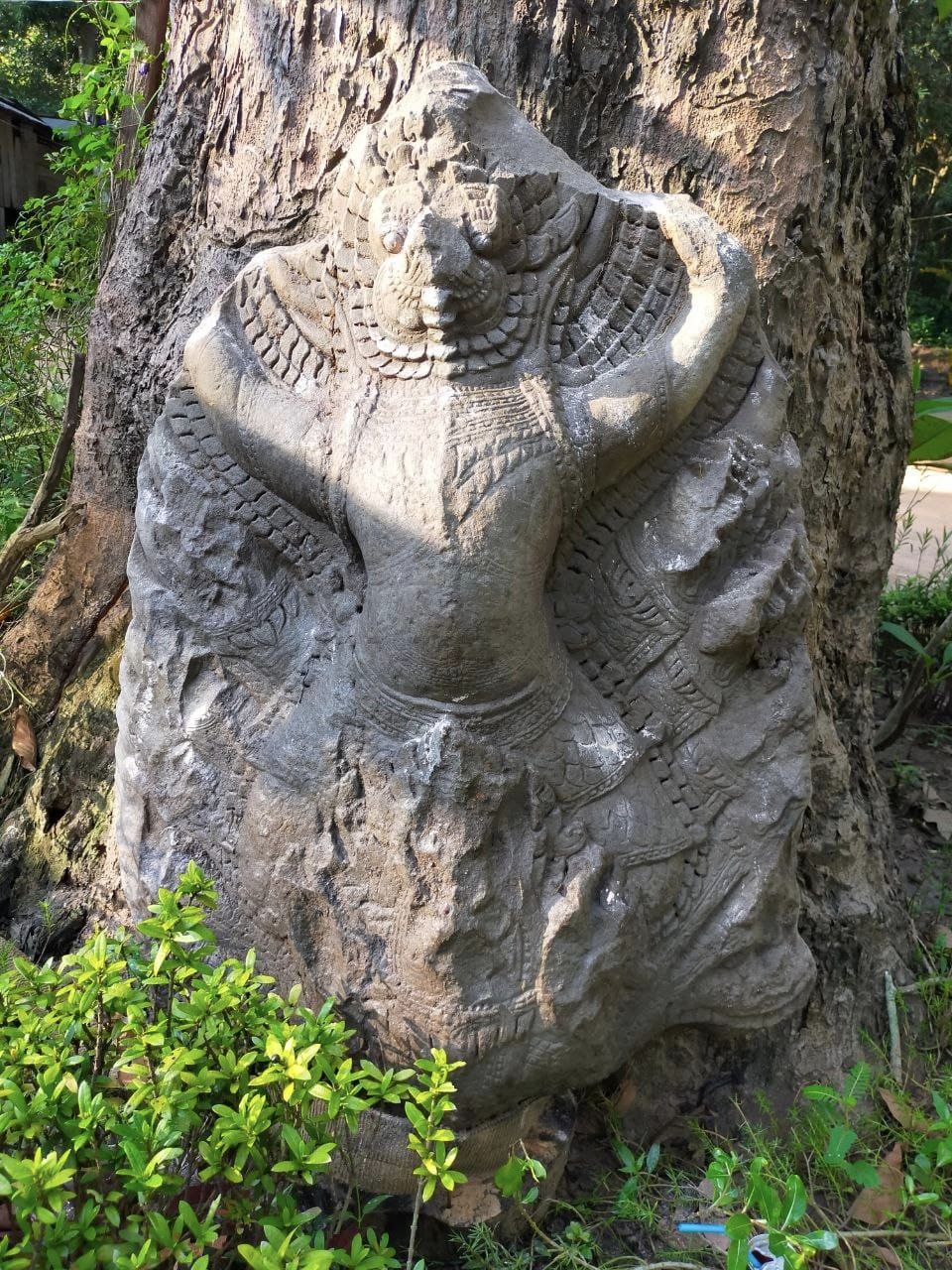 លោក សុម៉ាឡា បន្តថា បំណែកក្បាលនាគនេះ មានត្រឹមតែកនាគមកក្បាលខាងលើដែលមាន បណ្តោយ១.២ម៉ែត្រ ទទឹង១ម៉ែត្រ និងកម្រាស់០.៣ម៉ែត្រ បំណែកសត្វគ្រុឌជិះលើក្បាលនាគ ស្ថានភាពមុខនាគខាងមុខមានការខូចខាតច្រើនដោយអន្លើរ ដោយបាក់បែកមុខនាគ និងជុំវិញសងខាង។ រីឯសត្វគ្រុឌវិញ ត្រូវបានបាក់ច្រមុះ និងដៃផ្នែកនៅខាងលើ រួមទាំងផ្នែកខ្លះនៃក្បាល។