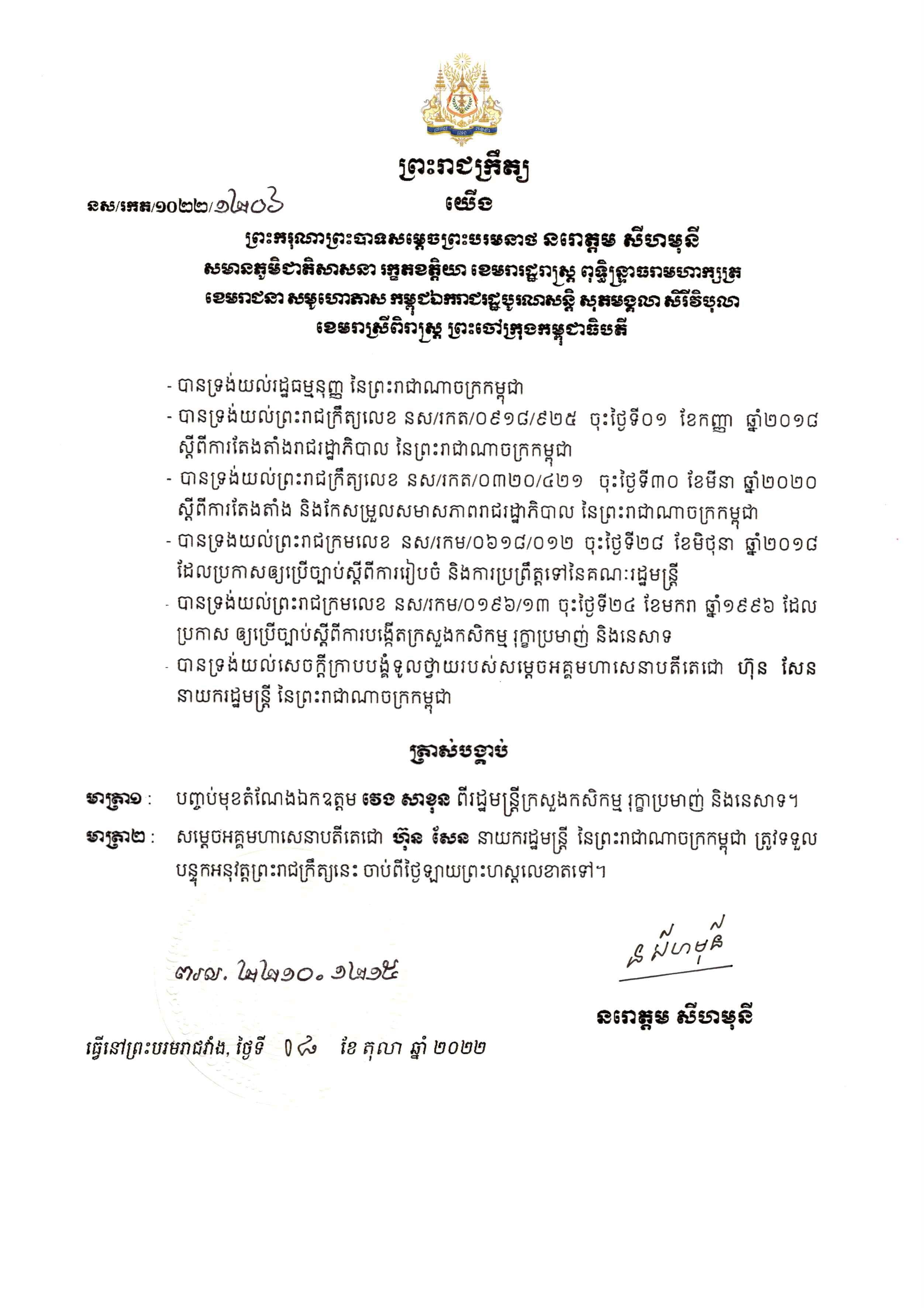 (ភ្នំពេញ)៖ ព្រះករុណា សម្តេច ព្រះបាទ ព្រះបរមនាថ នរោត្តម សីហមុនី ព្រះមហាក្សត្រនៃកម្ពុជា នៅថ្ងៃទី៨ ខែតុលា ឆ្នាំ២០២២នេះ បានចេញព្រះរាជក្រឹត្យបញ្ចប់មុខដំណែងលោក វេង សាខុន ពីរដ្ឋមន្រ្តីក្រសួងកសិកម្ម រុក្ខាប្រមាញ់ និងនេសាទ។ នេះបើតាមព្រះរាជក្រឹត្យរបស់ព្រះមហាក្សត្រ ដែលបណ្តាញព័ត៌មាន Fresh News ទើបទទួលបាននៅមុននេះបន្តិច។