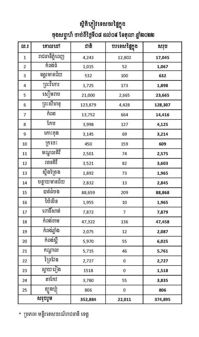(ភ្នំពេញ)៖ ភ្ញៀវទេសចរផ្ទៃក្នុងប្រចាំសប្តាហ៍នាថ្ងៃទី៨-៩ ខែតុលា ឆ្នាំ២០២២ មានចំនួនសរុប៣៧៤,៨៩៥នាក់ ក្នុងនោះភ្ញៀវជាតិមានចំនួន៣៥២,៨៨៤នាក់ និងភ្ញៀវបរទេសផ្ទៃក្នុងមានចំនួន២២,០១១នាក់។ នេះបើតាមលោក ថោង ខុន រដ្ឋមន្ត្រីក្រសួងទេសចរណ៍ ដែលបានបញ្ជាក់មកកាន់ Fresh News នាថ្ងៃទី១២ ខែតុលានេះ។