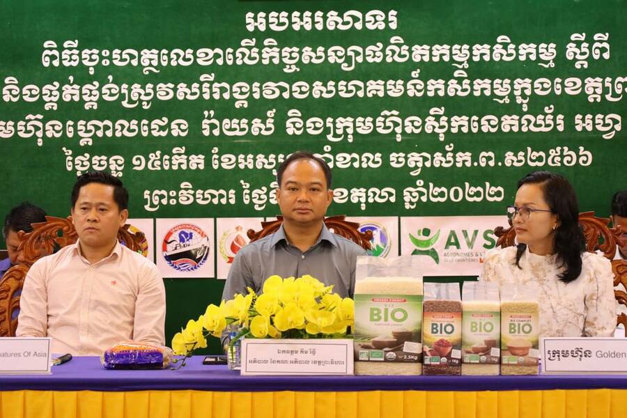 ខេត្តព្រះវិហារ៖ យោងតាមការចុះផ្សាយរបស់ ក្រសួងព័ត៌មាន នៅថ្ងៃទី១២ ខែតុលា ឆ្នាំ២០២២ បានឱ្យដឹងថា ក្រុមហ៊ុនស៊ីកនេតឈ័រ អហ្វអេស៊ា និងក្រុមហ៊ុនហ្គោលដិនរ៉ាយស៍ ដែលជាក្រុមហ៊ុនកែច្នៃនាំចេញអង្ករទៅទីផ្សារអន្ដរជាតិ មានផែនការទិញស្រូវសរីរាង្គ ឱ្យបានចំនួន ២៥០០តោន ក្នុងឆ្នាំ ២០២២នេះ ពីសហគមន៍ចំនួន១០ ក្នុងខេត្តព្រះវិហារ តាមរយៈការធ្វើផលិតកម្មកសិកម្ម តាមកិច្ចសន្យា។ ការចុះកិច្ចសន្យាទិញ-លក់ស្រូវសរីរាង្គ រវាងក្រុមហ៊ុនបញ្ជាទិញ និងសហគមន៍កសិករក្នុងខេត្តព្រះវិហារនេះ ត្រូវបានធ្វើឡើងនាថ្ងៃទី១០ ខែតុលា ឆ្នាំ២០២២ នៅមន្ទីរកសិកម្ម រុក្ខាប្រមាញ់ និងនេសាទខេត្ត ក្រោមអធិបតីភាព ឯកឧត្តម គីម រិទ្ធី អភិបាលនៃគណៈអភិបាល ខេត្តព្រះវិហារ។
