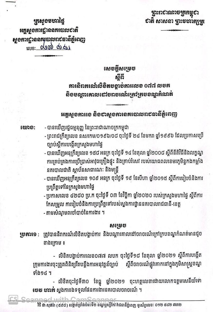 ខាងក្រោមនេះ ជាសេចក្ដីសម្រេចរបស់ស្នងការដ្ឋាននគរបាលរាជធានីភ្នំពេញ៖