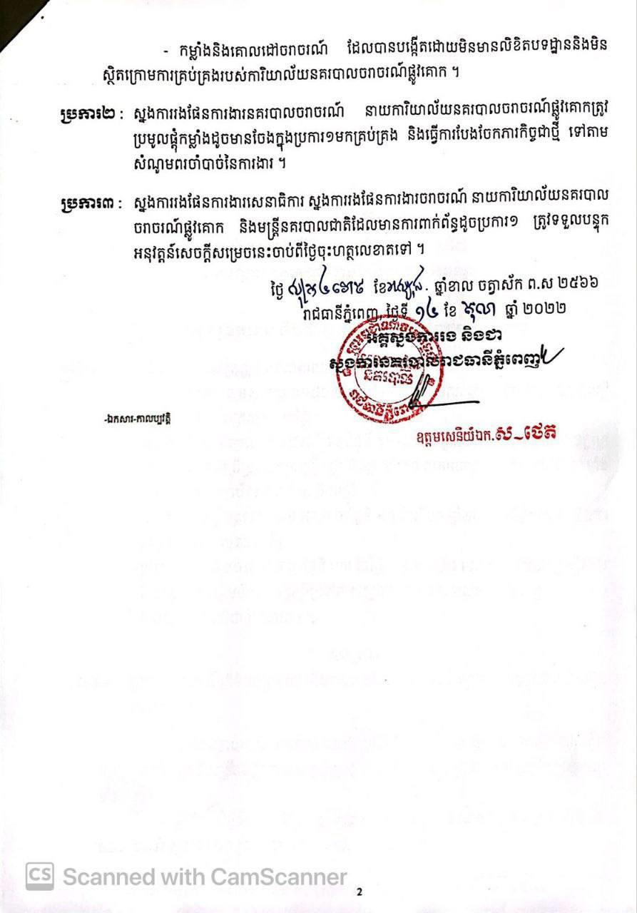 ក្នុងសេចក្ដីសម្រេចដែលបណ្ដាញព័ត៌មាន Fresh News ទទួលបាននៅថ្ងៃទី១៧ ខែតុលា ឆ្នាំ២០២២នេះ លោកឧត្តមសេនីយ៍ឯក ស ថេត បានអះអាងថា កម្លាំង និងគោលដៅចរាចរណ៍ ដែលបានបង្កើតដោយមិនមានលិខិតបទដ្ឋាន និងមិនស្ថិតក្រោមការគ្រប់គ្រងរបស់ការិយាល័យនគរបាលចរាចរណ៍ផ្លូវគោក។