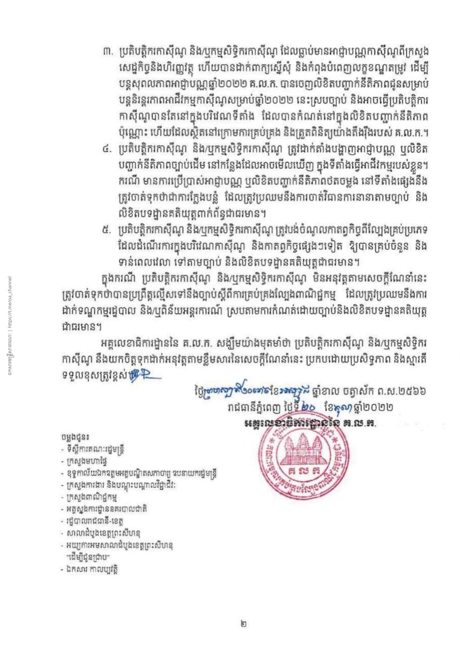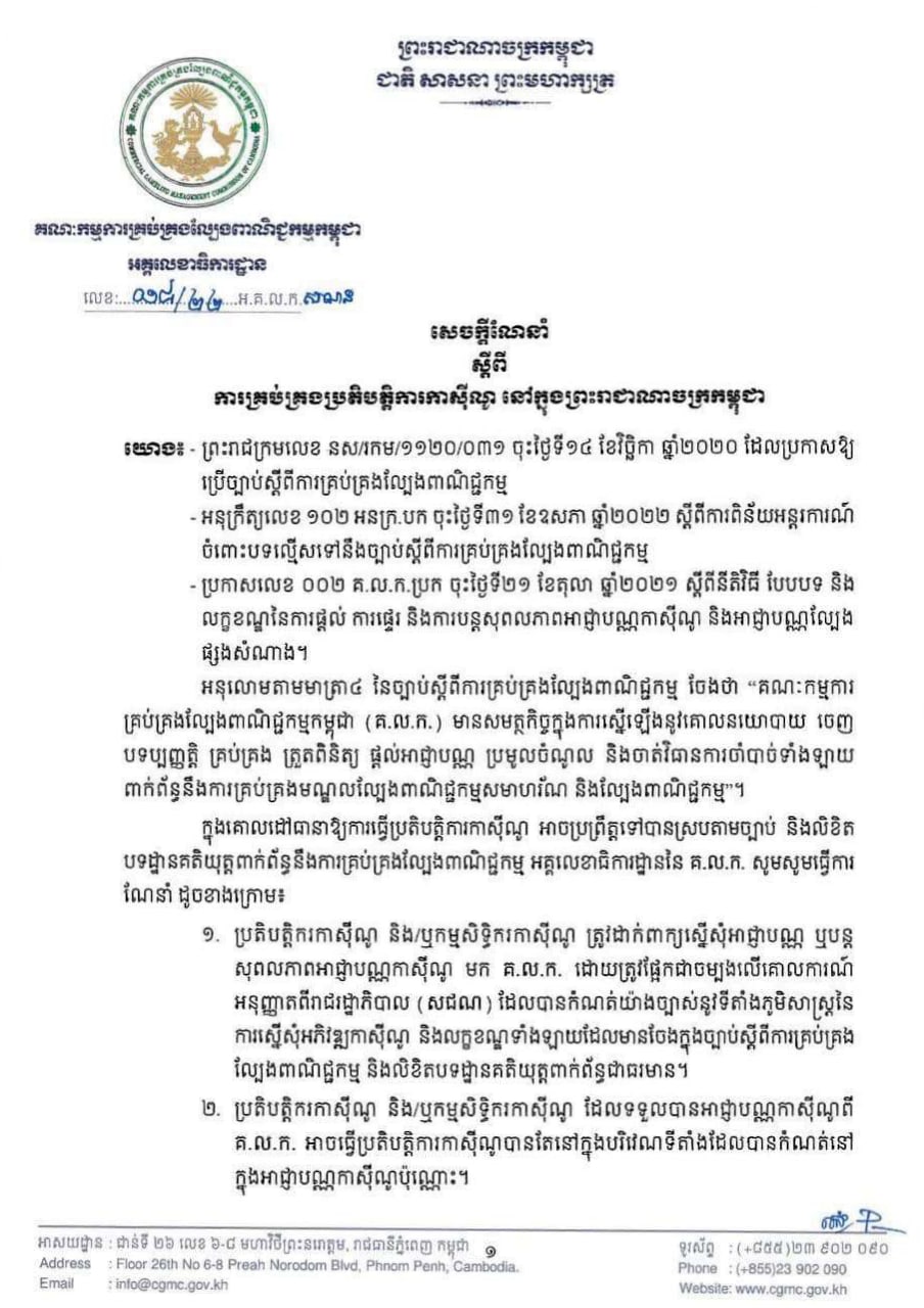 ខាងក្រោមនេះ ជាសេចក្ដីណែនាំ របស់គណៈកម្មការគ្រប់គ្រងល្បែងពាណិជ្ជកម្មកម្ពុជា ដែលមានខ្លឹមសារទាំងស្រុង៖