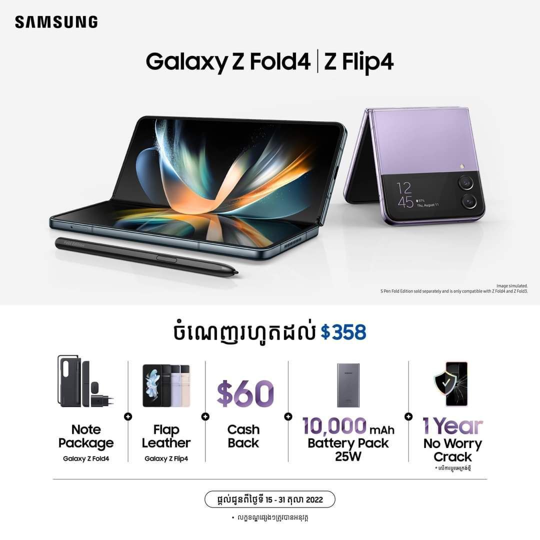 យ៉ាងម៉េចដែរ..លក្ខណៈសម្បត្តិប៉ុណ្ណឹងស្កប់ចិត្តទេហ្វេនៗ…!! តែខ្ញុំហ៊ានធានាថាតារាទាំង 2 ដួងនេះមិនធ្វើឪ្យលោកអ្នកខកចិត្តនោះទេ។ ហូ…ក្រៅពីលក្ខណៈសម្បតិ្តល្អហើយ ក្រុមហ៊ុន សាមសុង ក៏នៅតែបន្តផ្ដល់ជូនយ៉ាងពិសេសដែលចំណេញភ្លាមៗរហូតដល់ $358 សម្រាប់រាល់ការទិញ Galaxy Z Fold4 និង Galaxy Z Flip4 ដូចខាងក្រោម៖