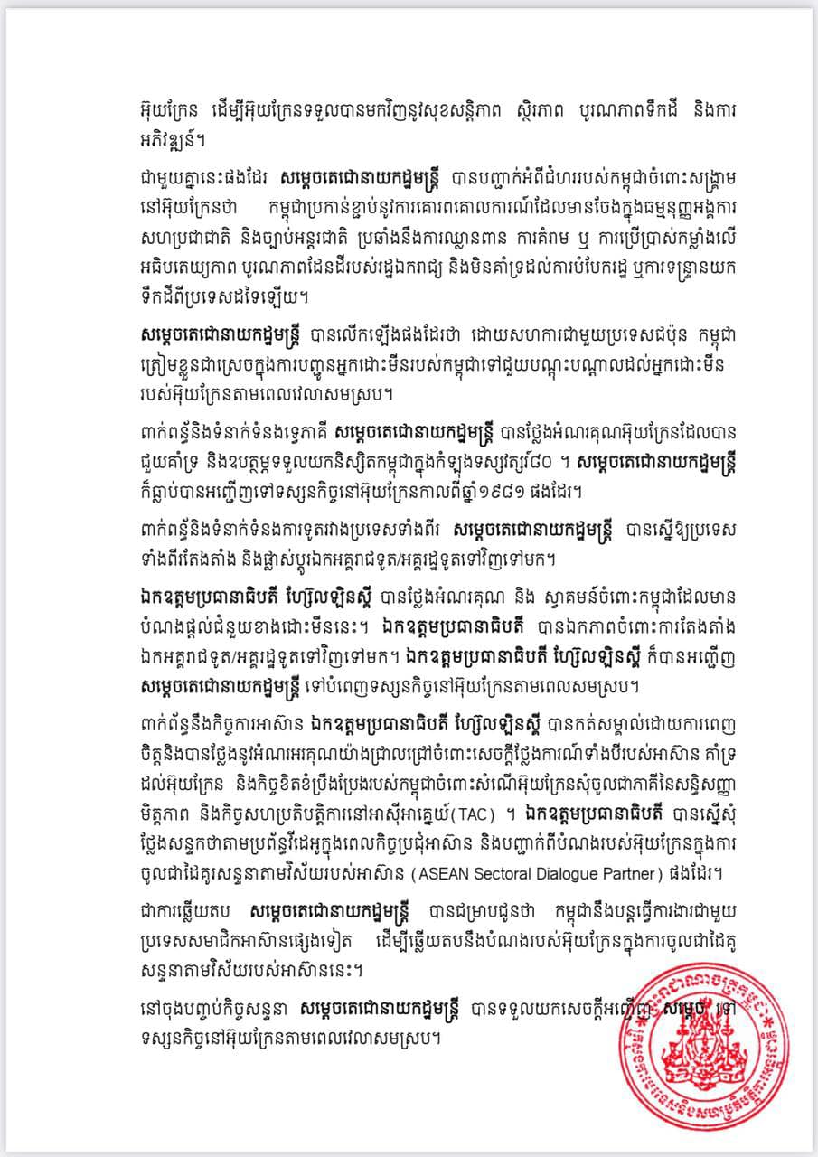 «សម្តេចតេជោនាយកដ្ឋមន្ត្រី បញ្ជាក់ថា កម្ពុជាផ្តល់សារសំខាន់ដល់ការចរចា និងដំណោះស្រាយដោយសន្តិវិធី និងសង្ឃឹមថា ភាគីពាក់ពន្ធ័ទាំងអស់នឹងខិតខំរកដំដោះស្រាយគ្រប់ជ្រុងជ្រោយដើម្បីបញ្ចប់សង្រ្គាមនៅអ៊ុយក្រែន ដើម្បីអ៊ុយក្រែនទទួលបានមកវិញនូវសុខសន្តិភាព ស្ថិរភាព បូរណភាពទឹកដី និងការអភិវឌ្ឍន៍»។ នេះបើតាមសេចក្តីប្រកាសរបស់ក្រសួងការបរទេស អំពីលទ្ធផលនៃជំនួបតាមទូរស័ព្ទរវាងសម្តេចតេជោ ហ៊ុន សែន និងប្រធានាធិបតីអ៊ុយក្រែន។