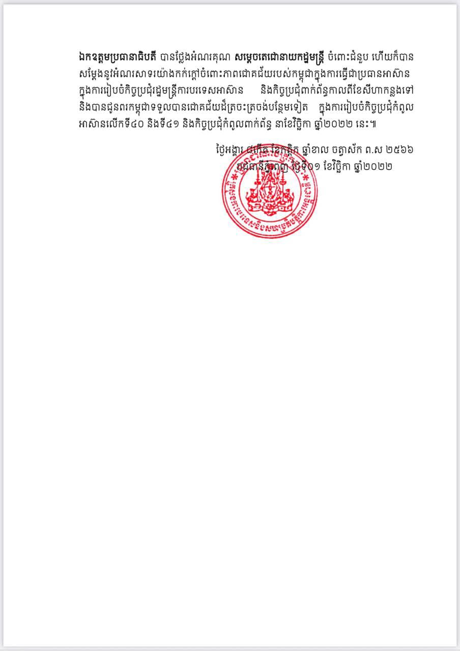 សម្តេចតេជោ ហ៊ុន សែន បានបញ្ជាក់បែបនេះ ក្នុងជំនួបតាមទូរស័ព្ទលើកដំបូងជាមួយ ប្រធានាធិបតីអ៊ុយក្រែន កាលពីថ្ងៃទី០១ ខែវិច្ឆិកា ឆ្នាំ២០២២ ម្សិលមិញនេះ។