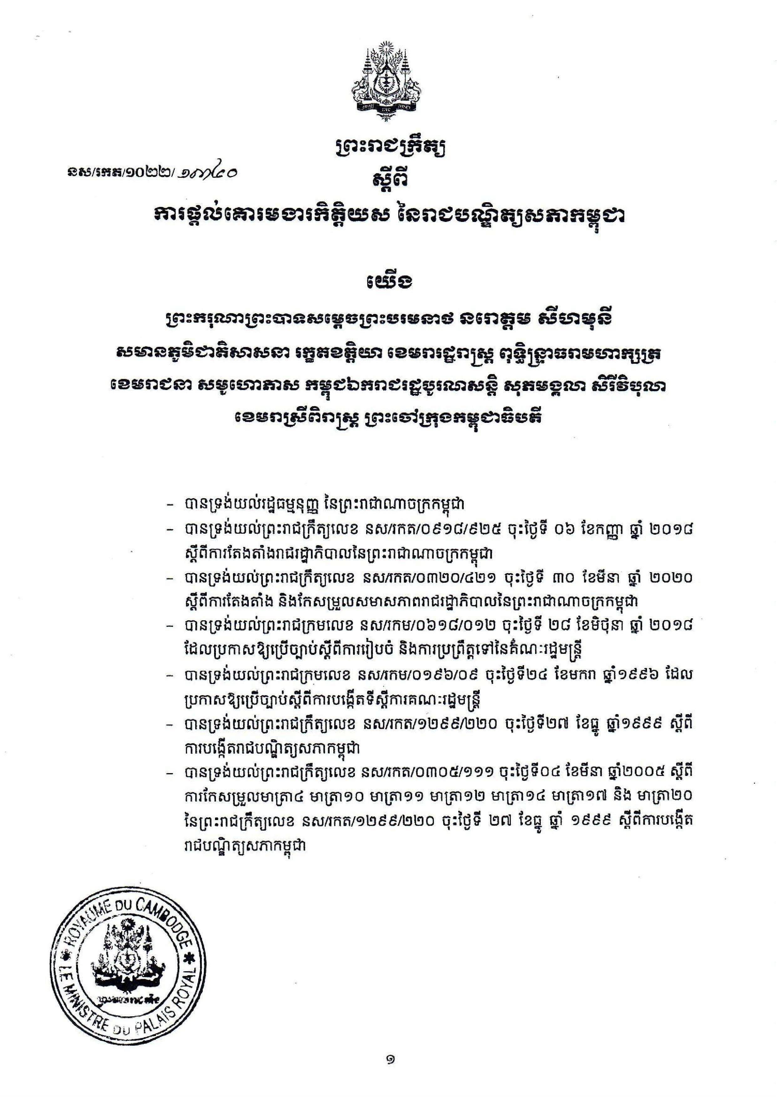 ខាងក្រោមនេះជាព្រះរាជក្រឹត្យ៖