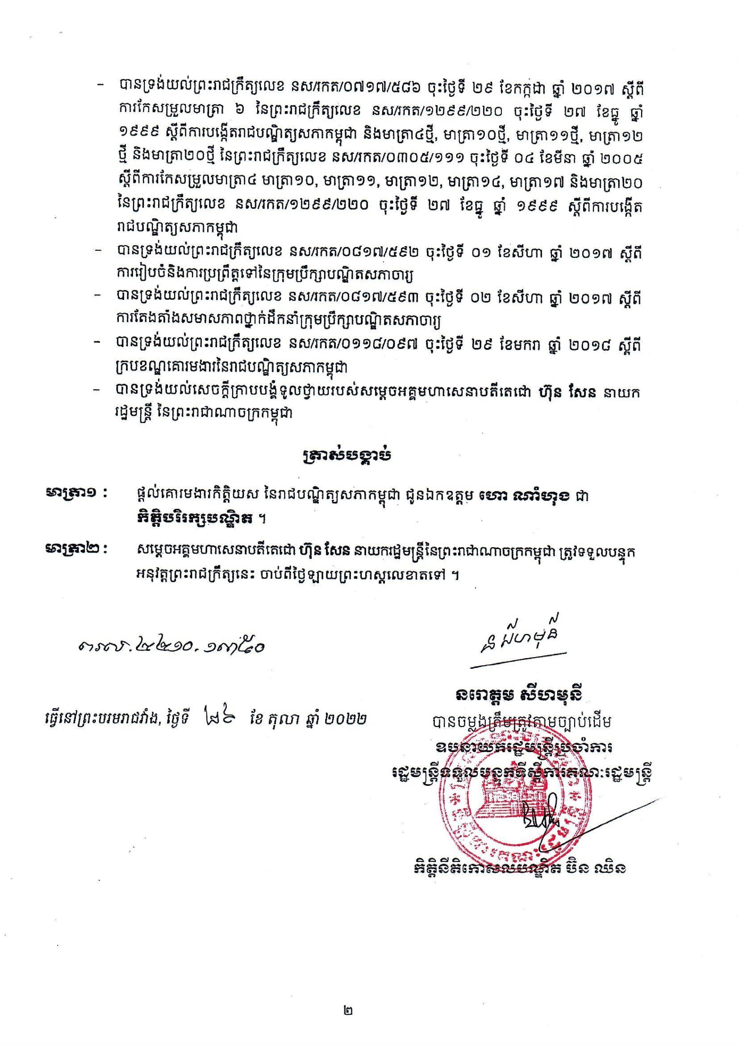 ព្រះមហាក្សត្រ ចេញព្រះរាជក្រឹត្យត្រាស់បង្គាប់ផ្តល់គោរមងារកិត្តិយស នៃរាជបណ្ឌិត្យសភាកម្ពុជា ជូនឧបនាយករដ្ឋមន្ត្រី ហោ ណាំហុង ជា «កិត្តិបរិរក្សបណ្ឌិត»