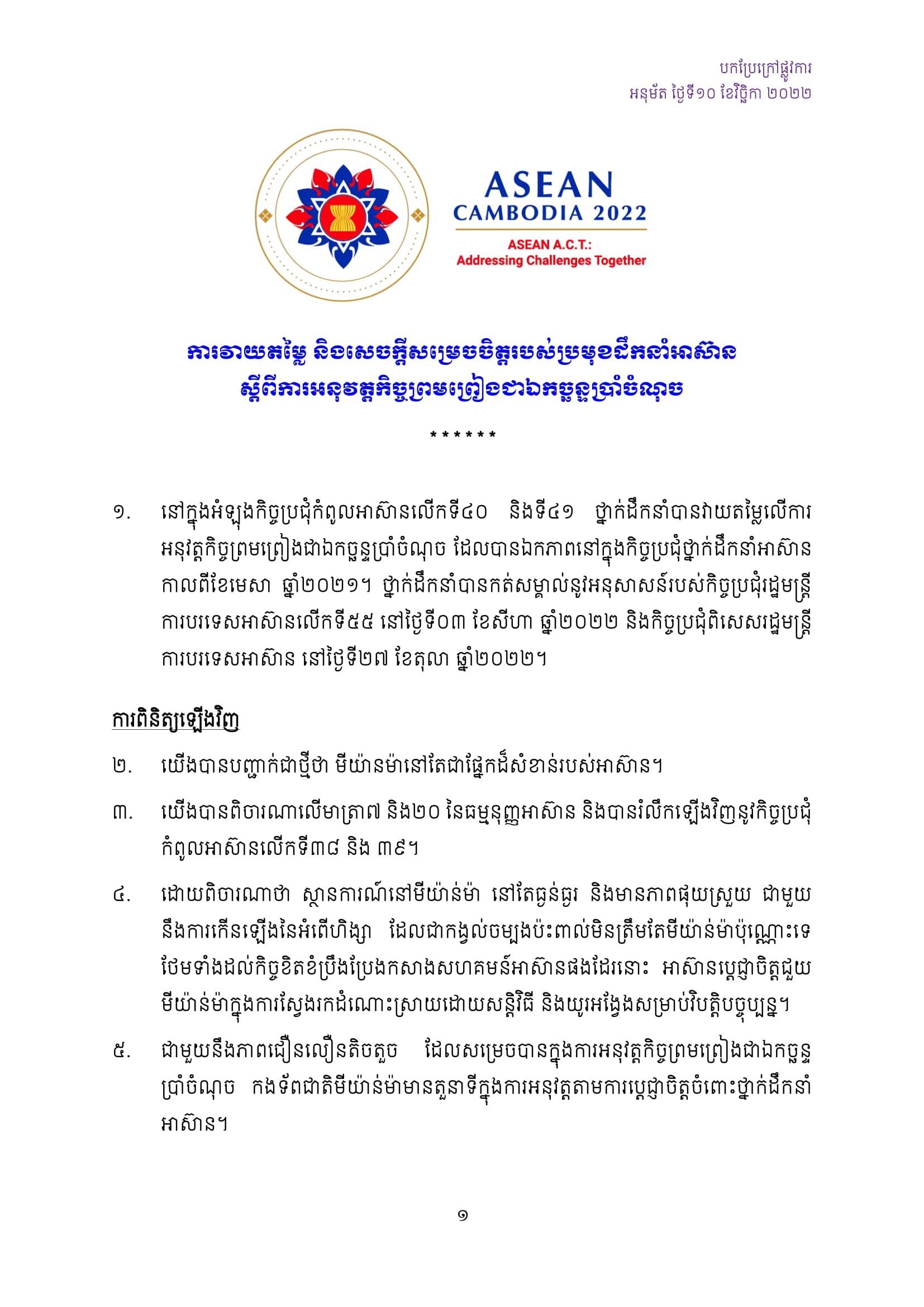 មេដឹកនាំអាស៊ាន យល់ឃើញថា ស្ថានការណ៍នៅមីយ៉ាន់ម៉ានៅតែធ្ងន់ធ្ងរ និងមានភាពផុយស្រួយ ជាមួយនឹងការកើនឡើងនៃអំពើហិង្សា ដែលជាកង្វល់ចម្បងប៉ះពាល់មិនត្រឹមតែមីយ៉ាន់ម៉ាប៉ុណ្ណោះទេ ថែមទាំងដល់កិច្ចខិតខំប្រឹងប្រែងកសាងសហគមន៍អាស៊ានផងដែរនោះ អាស៊ានប្ដេជ្ញាចិត្តជួយមីយ៉ាន់ម៉ាក្នុងការស្វែងរកដំណោះស្រាយដោយសន្តិវិធី និងយូរអង្វែងសម្រាប់វិបត្តិបច្ចុប្បន្ន។ជាមួយនឹងភាពជឿនលឿនតិចតួច ដែលសម្រេចបានក្នុងការអនុវត្តកិច្ចព្រមព្រៀងជាឯកច្ឆន្ទប្រាំចំណុច កងទ័ពជាតិមីយ៉ាន់ម៉ាមានតួនាទីក្នុងការអនុវត្តតាមការប្តេជ្ញាចិត្តចំពោះថ្នាក់ដឹកនាំ អាស៊ាន។