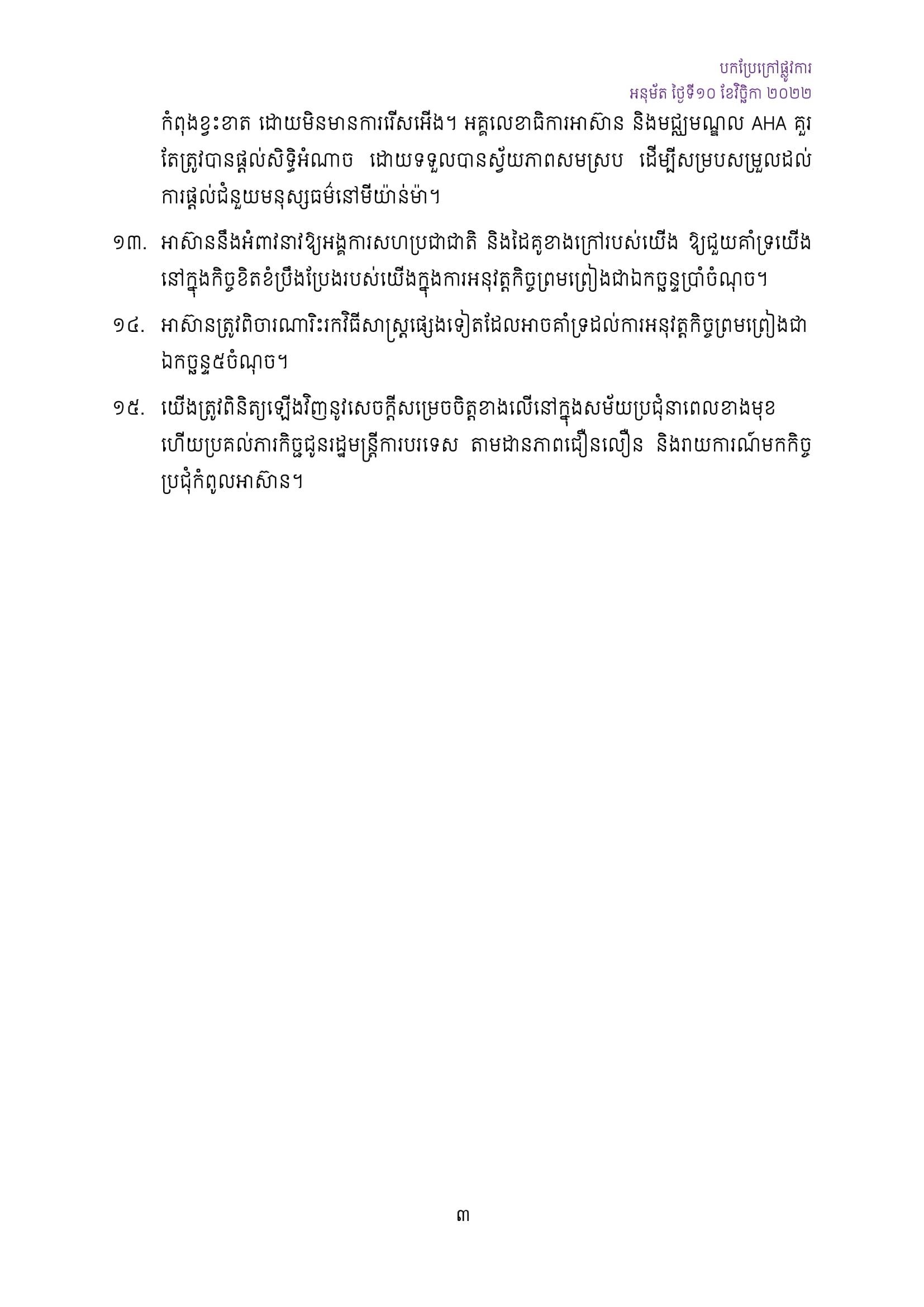 * អាស៊ាននឹងអំពាវនាវឱ្យអង្គការសហប្រជាជាតិ និងដៃគូខាងក្រៅរបស់យើង ឱ្យជួយគាំទ្រយើង នៅក្នុងកិច្ចខិតខំប្រឹងប្រែងរបស់យើងក្នុងការអនុវត្តកិច្ចព្រមព្រៀងជាឯកច្ឆន្ទ្រប្រាំចំណុច។