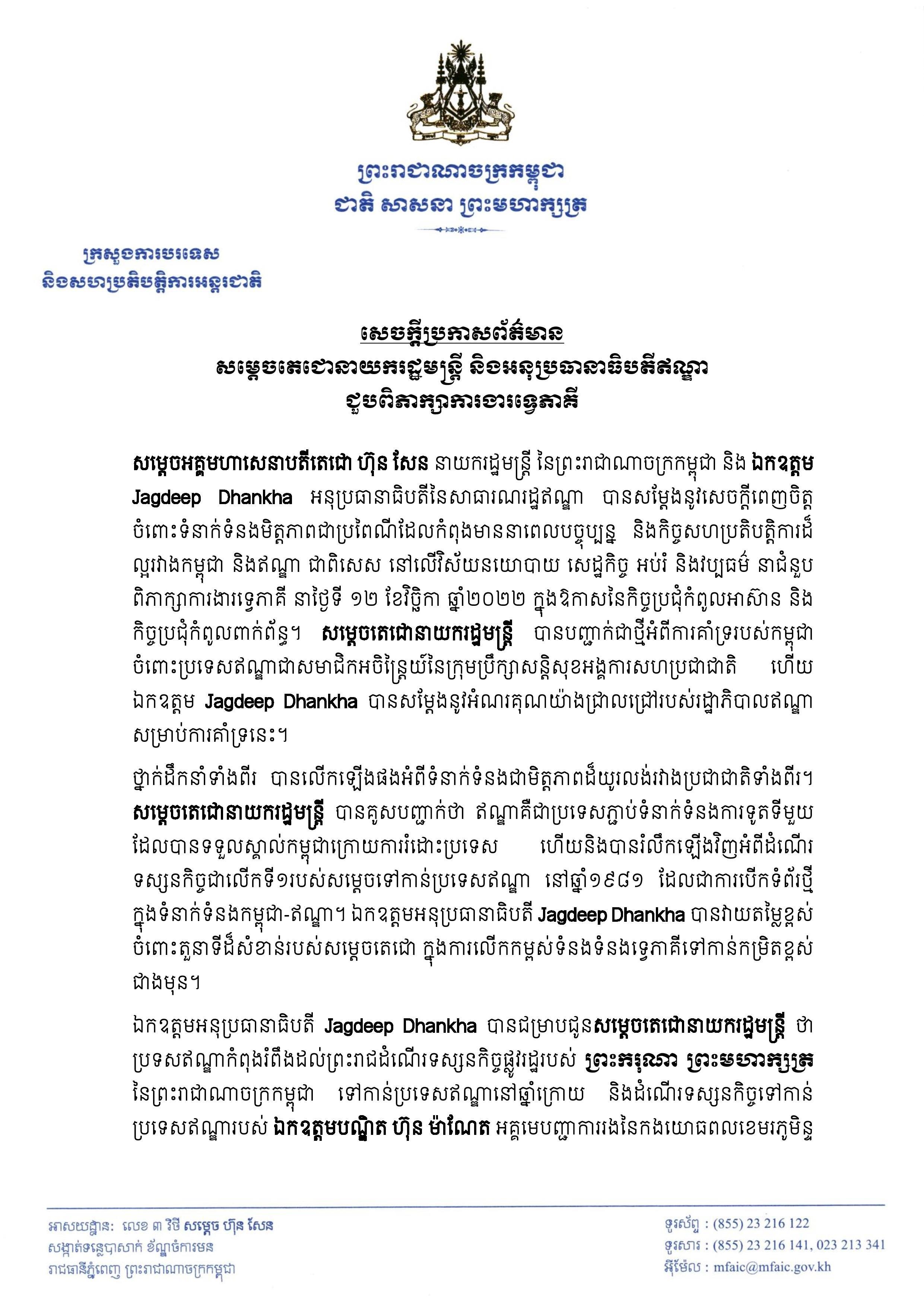 (ភ្នំពេញ)៖ កម្ពុជា-ឥណ្ឌា នៅថ្ងៃទី១២ ខែវិច្ឆិកា ឆ្នាំ២០២២នេះ បានផ្លាស់ប្តូរឯកសារដែលបានចុះហត្ថលេខារួចចំនួន៤ ក្រោមអធិបតីភាព សម្តេចតេជោ ហ៊ុន សែន នាយករដ្ឋមន្ត្រីនៃកម្ពុជា និង លោក Jagdeep Dhankha អនុប្រធានាធិបតីឥណ្ឌា។ នេះបើតាមការប្រកាសរបស់ក្រសួងការបរទេស។