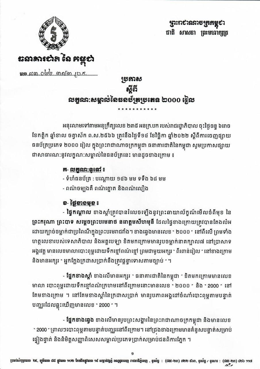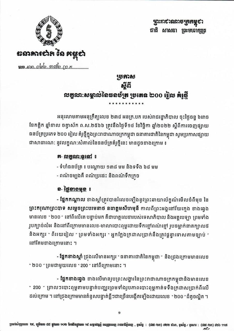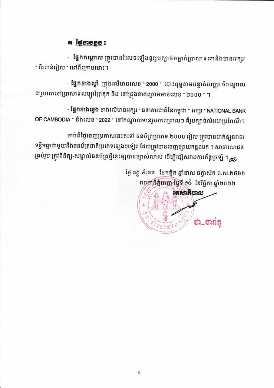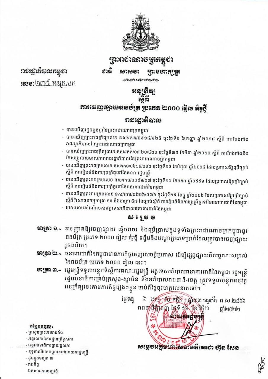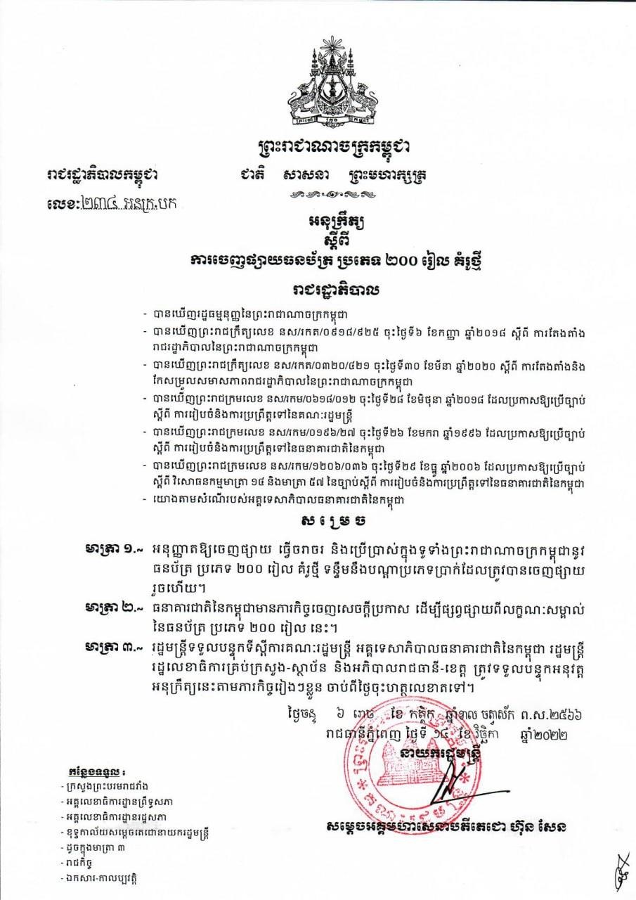 (ភ្នំពេញ)៖ រាជរដ្ឋាភិបាលកម្ពុជា បានចេញអនុក្រឹត្យសម្រេចដាក់ឲ្យចរាចរក្រដាសប្រាក់២០០០រៀល និង២០០រៀល គំរូថ្មីជាផ្លូវការ ចាប់ពីថ្ងៃទី១៤ ខែវិច្ឆិកា ឆ្នាំ២០២២នេះ។