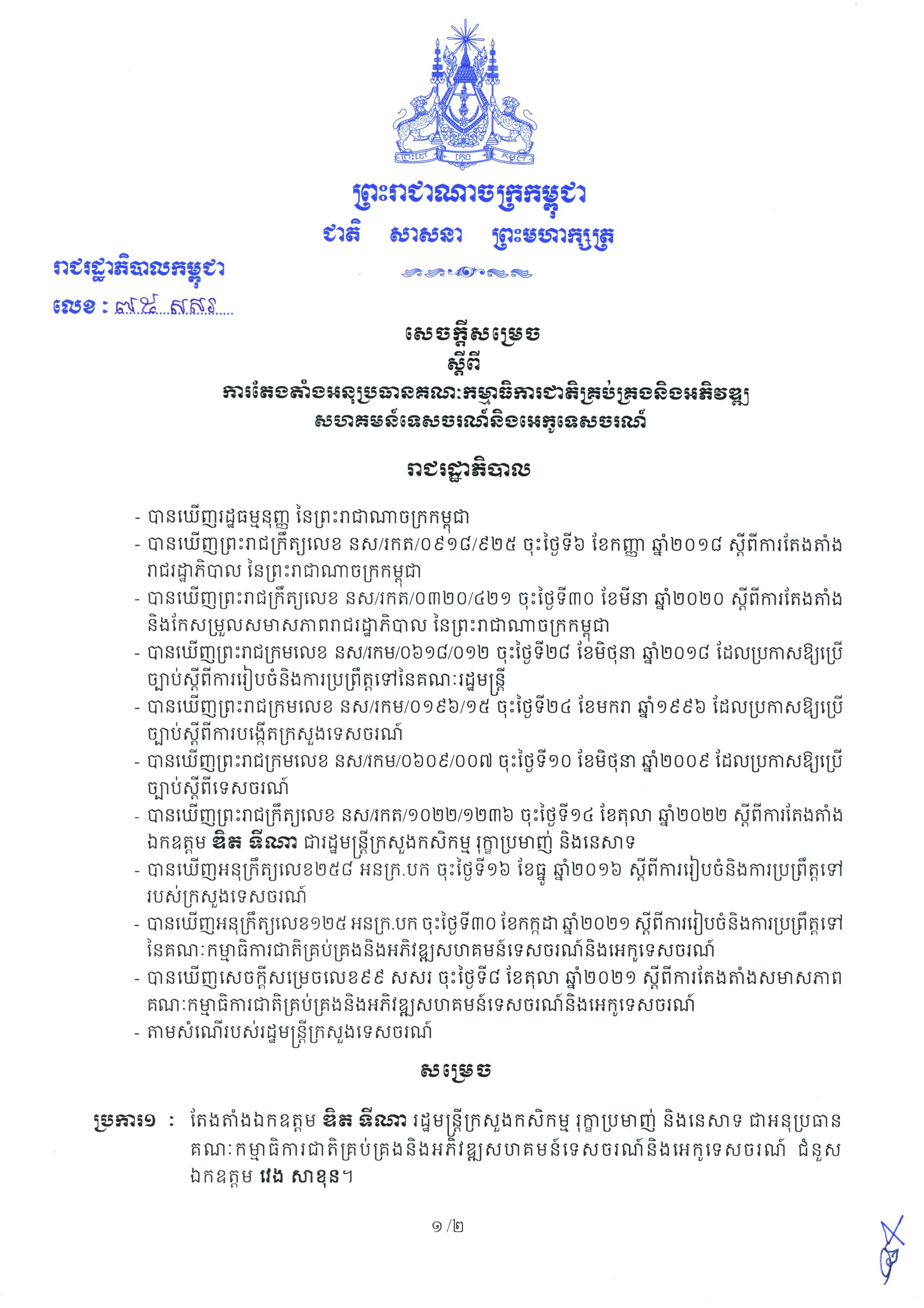 (ភ្នំពេញ)៖ សម្ដេចតេជោ ហ៊ុន​ សែន នាយករដ្ឋមន្ដ្រីនៃកម្ពុជា បានចេញសេចក្ដីសម្រេចតែងតាំងលោក ឌិត ទីណា រដ្ឋមន្ដ្រីក្រសួងកសិកម្ម រុក្ខាប្រមាញ់ និងនេសាទ ជាអនុប្រធានគណៈកម្មាធិការជាតិគ្រប់គ្រង និងអភិវឌ្ឍសហគមន៍ទេសចរណ៍ និងអេកូទេសចរណ៍ ជំនួសលោក វេង សាខុន។ នេះបើតាមសេចក្ដីសម្រេច ដែលបណ្ដាញព័ត៌មាន Fresh News ទទួលបាននៅថ្ងៃទី១៥ ខែវិច្ឆិកា ឆ្នាំ២០២២៕