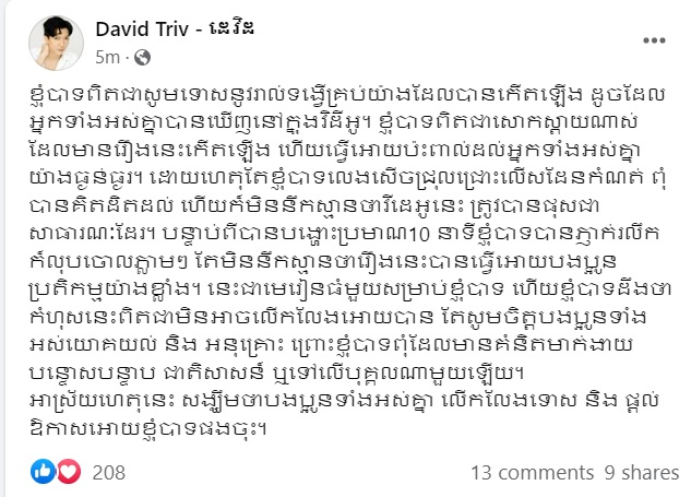 បន្ទាប់ពីបានបង្ហោះប្រមាណ១០នាទីខ្ញុំបាទបានភ្ញាក់រលឹកក៏លុបចោលភ្លាមៗ តែមិននឹកស្មានថារឿងនេះបានធ្វើឱ្យបងប្អូនប្រតិកម្មយ៉ាងខ្លាំង។ នេះជាមេរៀនធំមួយសម្រាប់ខ្ញុំបាទ ហើយខ្ញុំបាទដឹងថាកំហុសនេះពិតជាមិនអាចលើកលែងឱ្យបាន តែសូមចិត្តបងប្អូនទាំងអស់យោគយល់ និង អនុគ្រោះ ព្រោះខ្ញុំបាទពុំដែលមានគំនិតមាក់ងាយ បន្ទោសបន្ទាប ជាតិសាសន៍ ឬទៅលើបុគ្គលណាមួយឡើយ។ អាស្រ័យហេតុនេះ សង្ឃឹមថាបងប្អូនទាំងអស់គ្នា លើកលែងទោស និង ផ្តល់ឱកាសអោយខ្ញុំបាទផងចុះ»៕ ផ្តល់សិទ្ធិដោយ៖ ខ្មែរណូត