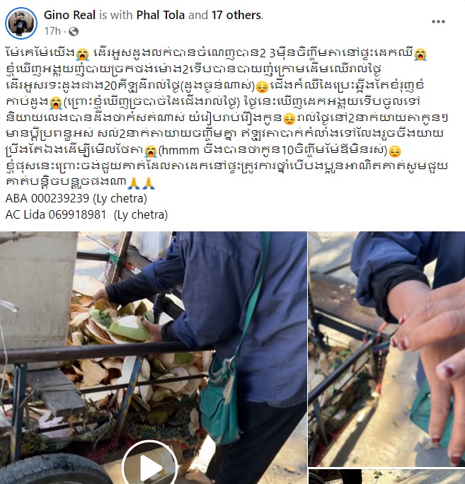 (ភ្នំពេញ)៖ ថ្មីៗនេះមានការចែករំលែកនៅលើបណ្តាញសង្គមនូវរឿងគួរឱ្យអាណិតអាសូរដោយលោកយាយវ័យចាស់ជរា ដើរអូសរទេះជាង២០គីឡូម៉ែត្រលក់ដូងទាំងដៃប្រេះឆ្អឹង ដើម្បីបានលុយចិញ្ចឹមលោកតាដេកឈឺនៅផ្ទះ។ បើយោង គណនីហ្វេសប៊ុកឈ្មោះ Gino Real បានសរសេររៀបរាប់ថា៖