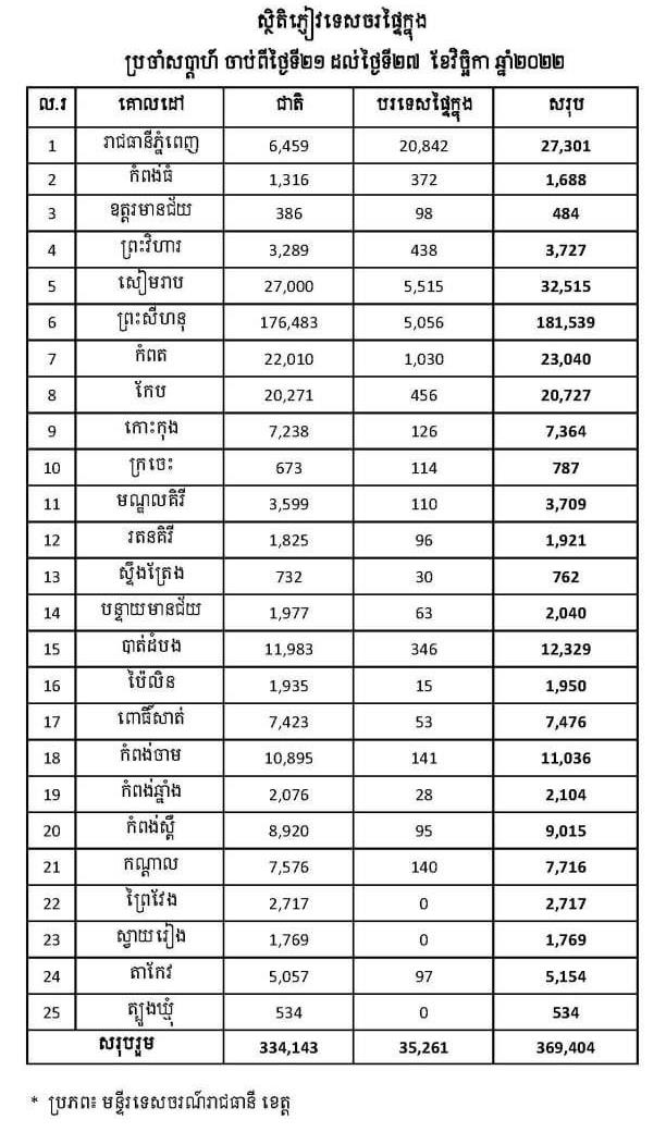(ភ្នំពេញ)៖ ភ្ញៀវទេសចរផ្ទៃក្នុងសប្តាហ៍ទី៤ ចាប់ពី ថ្ងៃទី២១-២៧ ខែវិច្ឆិកា ឆ្នាំ២០២២ មានចំនួន៣៦៩,៤០៤នាក់ ក្នុងនោះភ្ញៀវជាតិ៣៣៤,១៤៣នាក់ និងភ្ញៀវបរទេសផ្ទៃក្នុង៣៥,២៦១នាក់។