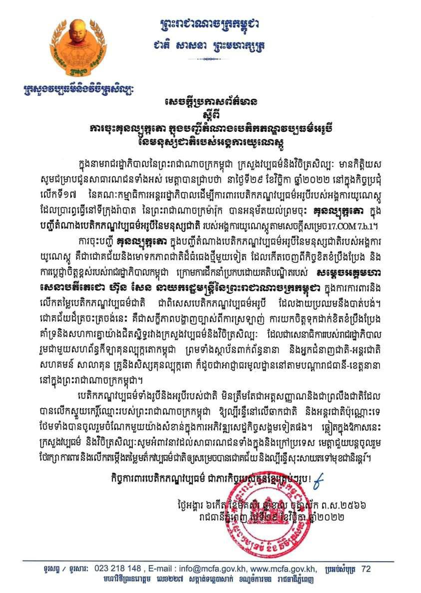 ក្រសួងវប្បធម៌ ចេញលិខិតពីការចុះ “គុនល្បុក្កតោ” ក្នុងបញ្ជីតំណាងនៃបេតិកភណ្ឌវប្បធម៌អរូបីនៃមនុស្សជាតិរបស់អង្គការយូណេស្កូ