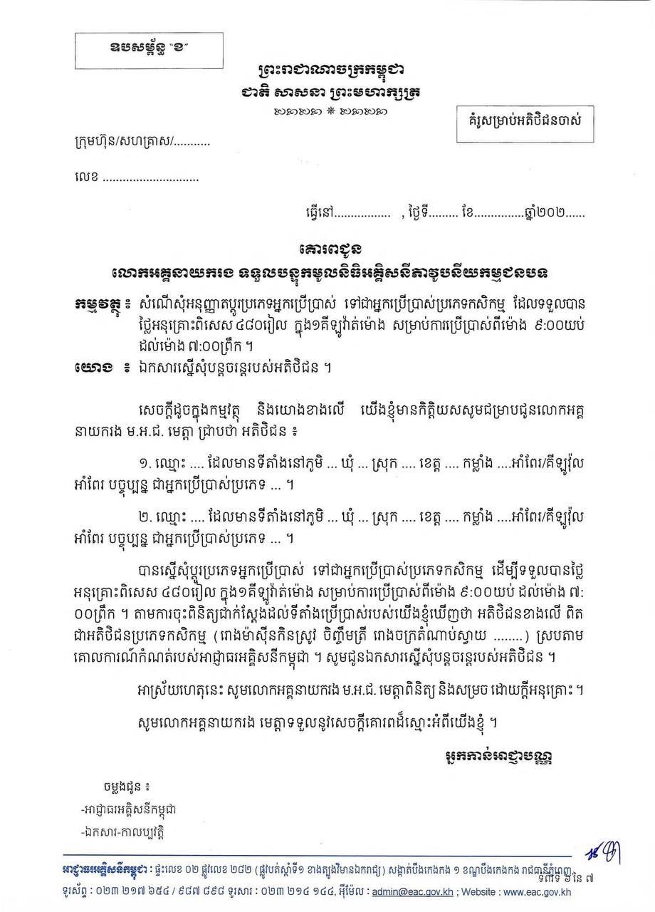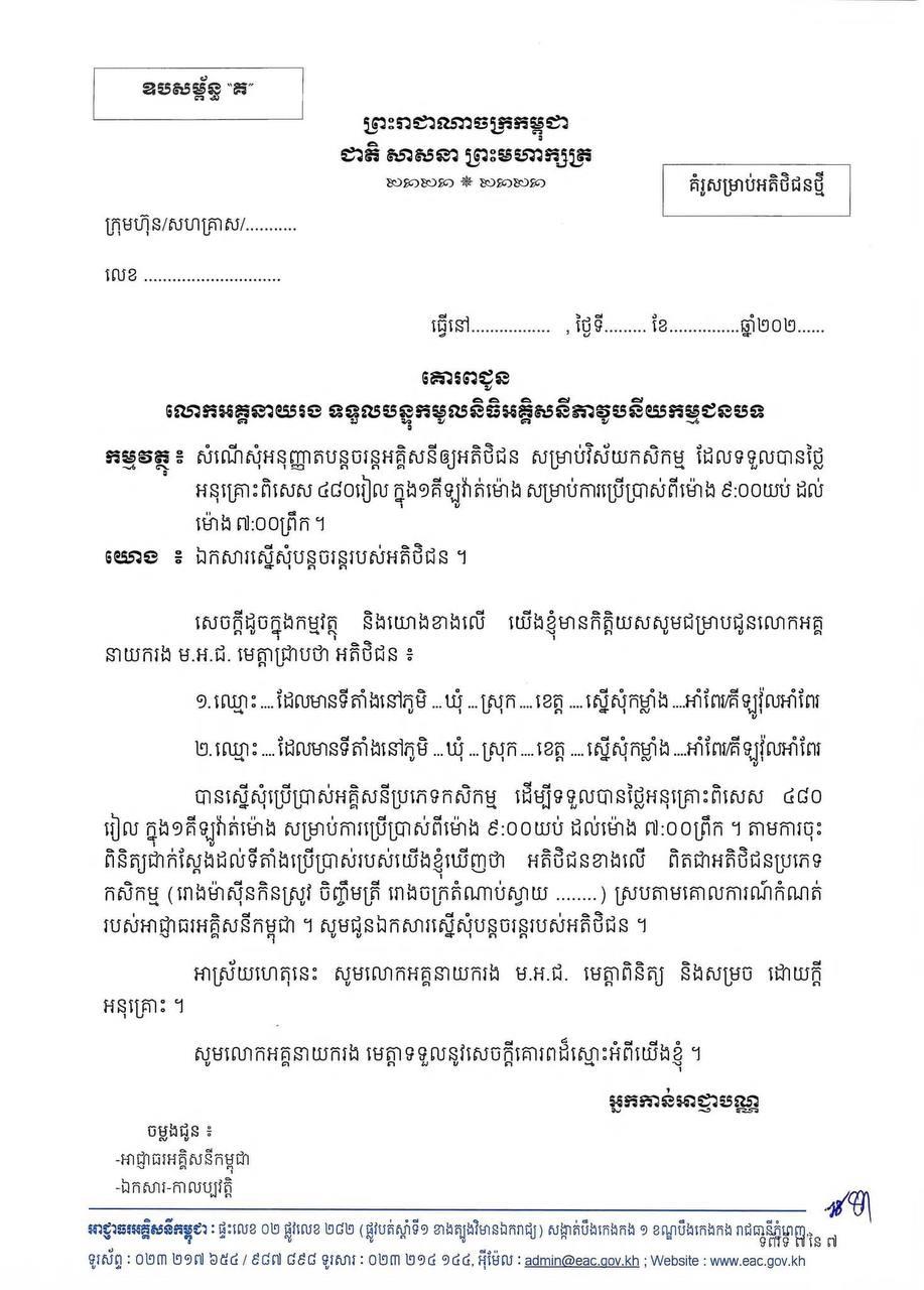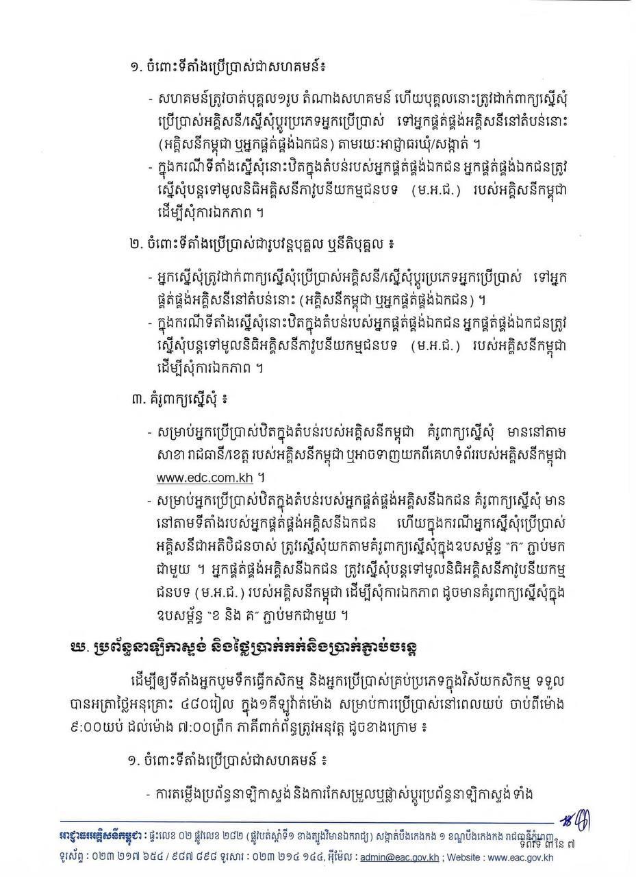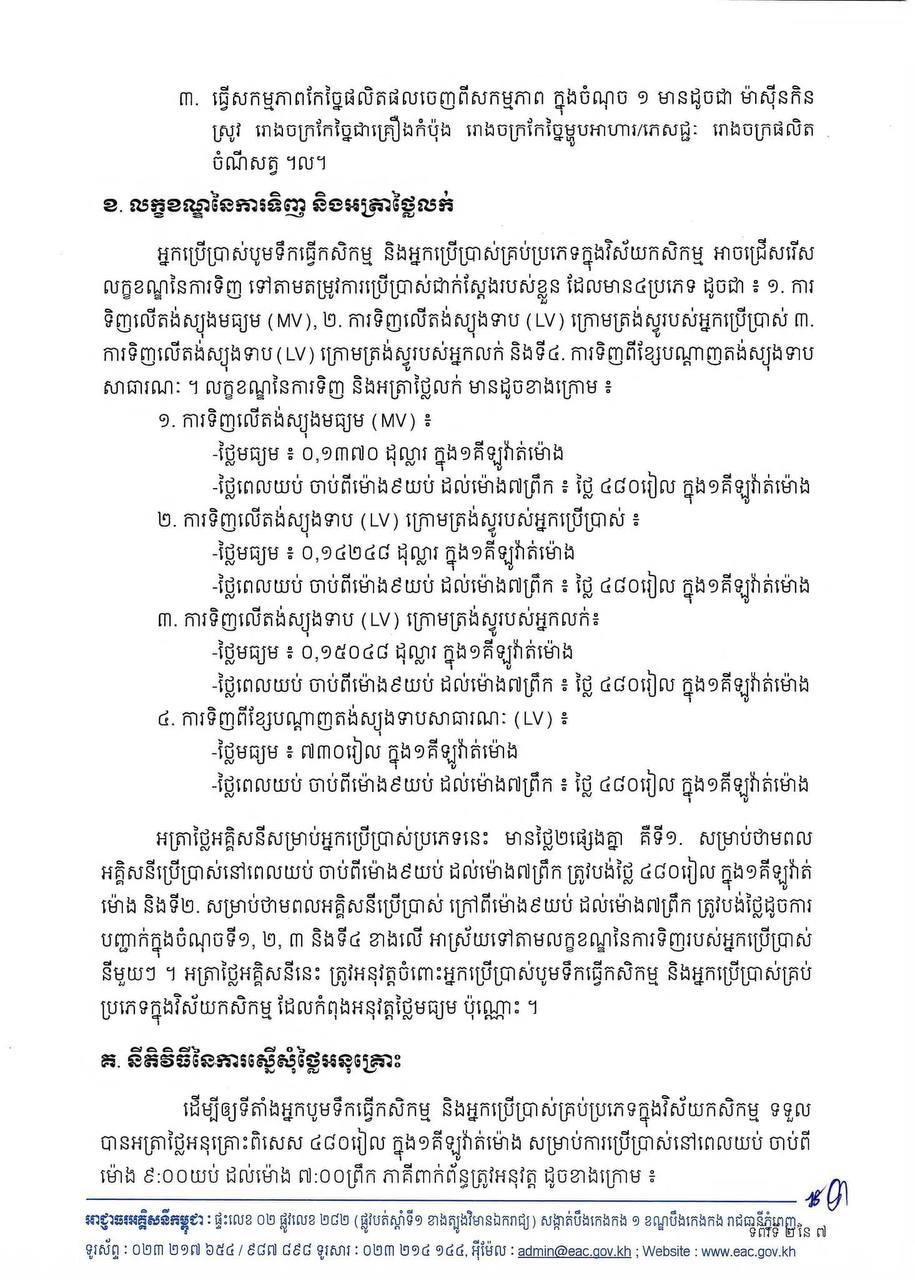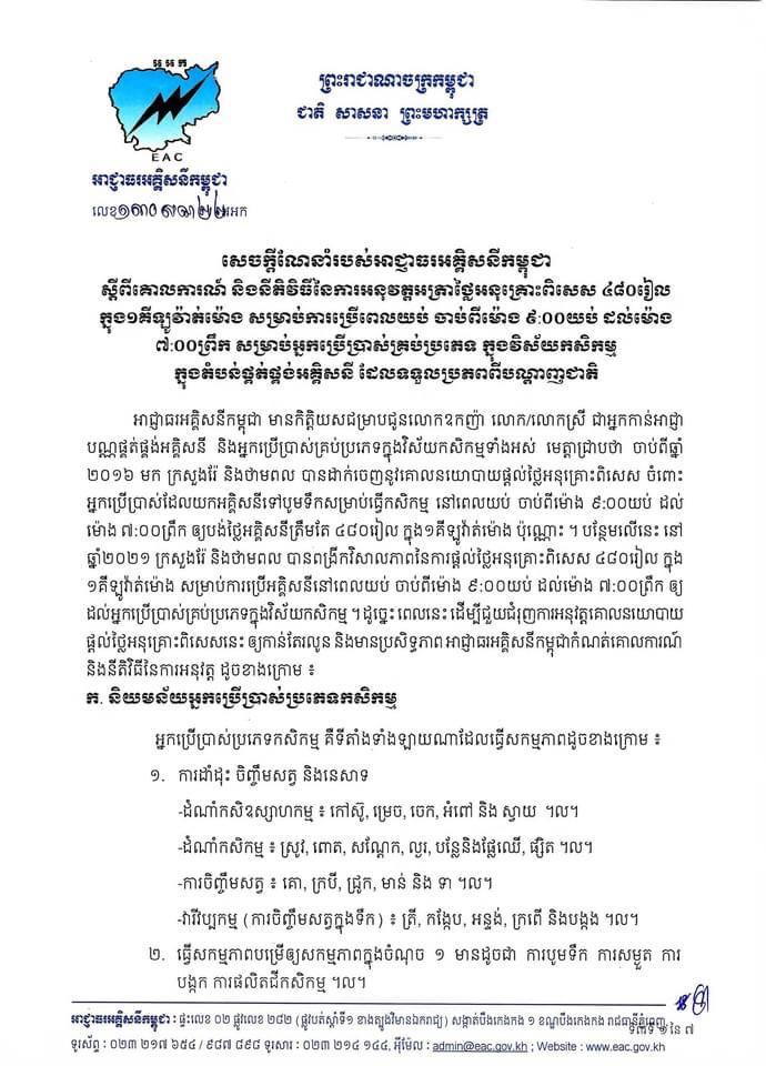 អាជ្ញាធរអគ្គិសនីកម្ពុជា ចេញសេចក្តីណែនាំពីគោលការណ៍ និងនីតិវិធីនៃការអនុវត្តអត្រាថ្លៃអនុគ្រោះពិសេស ៤៨០រៀលក្នុង១គីឡូវ៉ាត់ម៉ោង ក្នុងវិស័យកសិកម្ម