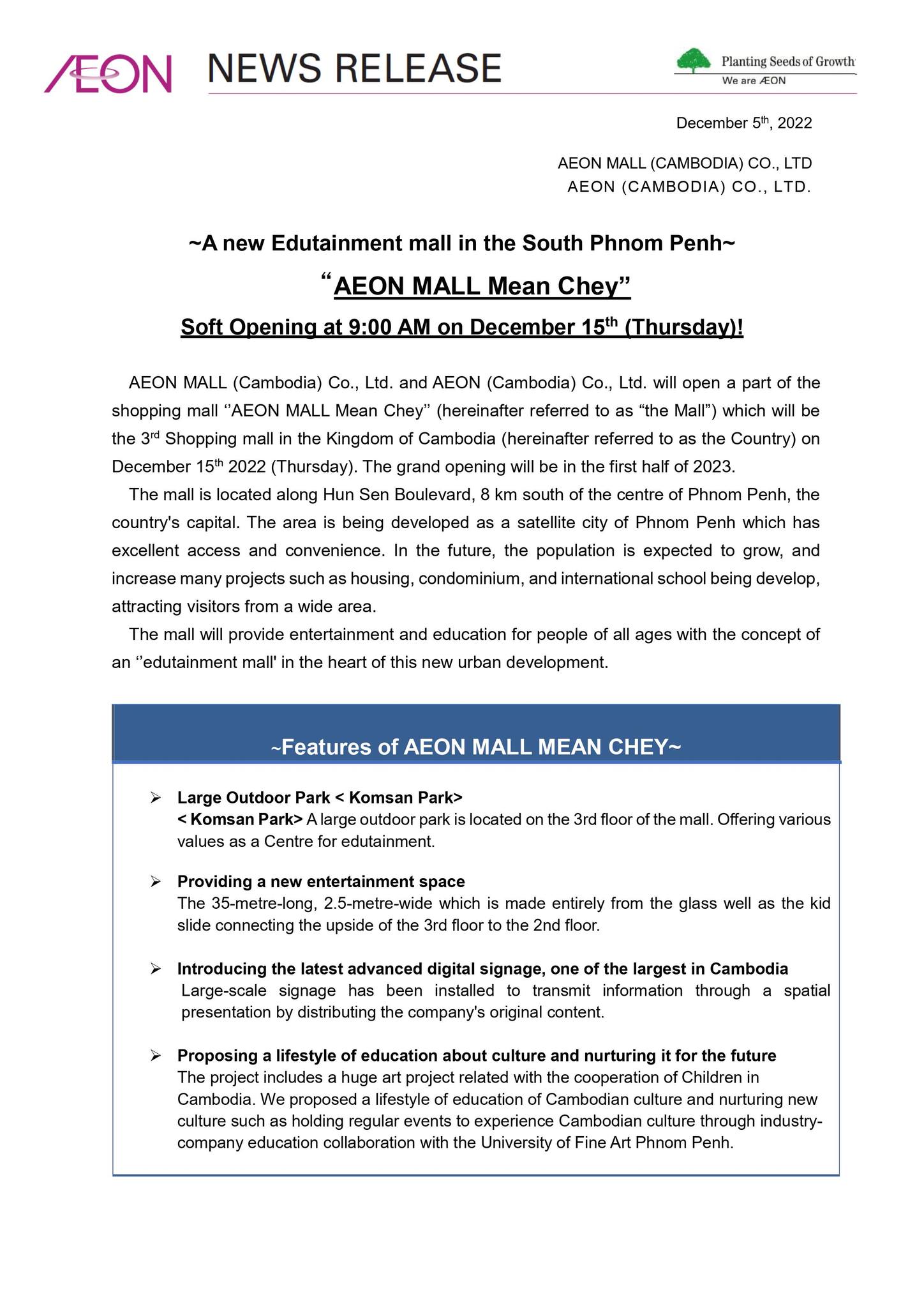 (ភ្នំពេញ)៖ នៅទីបំផុតផ្សារទំនើប អ៊ីអន ម៉ល មានជ័យ ឬ Aeon mall ទី៣ នឹងត្រូវដាក់ដំណើរការសាកល្បង នៅថ្ងៃព្រហស្បតិ៍ ទី១៥ ខែធ្នូ ឆ្នាំ២០២២ខាងមុខនេះ។ នេះបើយោងតាមសេចក្តីប្រកាសព័ត៌មានរបស់ក្រុមហ៊ុនអ៊ីអន ខេមបូឌា នៅថ្ងៃទី០៥ ខែធ្នូ ឆ្នាំ២០២២។