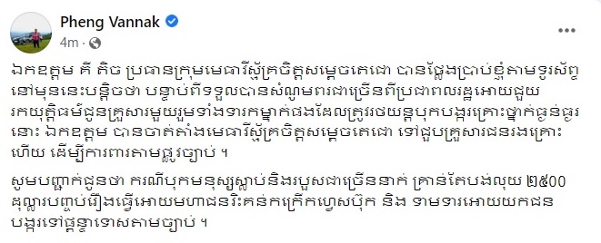 លោក​ ផែង​ វណ្ណៈ បានសរសេររៀបរាប់ថា៖ «ឯកឧត្តម​ គី​ តិច​ ប្រធាន​ក្រុម​មេធាវី​ស្ម័គ្រចិត្ត​សម្ដេចតេជោ​ បានថ្លែងប្រាប់​ខ្ញុំ​តាម​ទូរស័ព្ទ​នៅមុននេះបន្តិចថា​ បន្ទាប់​ពី​ទទួល​បាន​សំណូមពរ​ជាច្រើន​ពី​ប្រជាពលរដ្ឋ​ឱ្យជួយ​រកយុត្តិធម៌ជូន​គ្រួសារ​មួយរួមទាំង​ទារកម្នាក់ផង​ដែល​ត្រូវរថយន្តបុកបង្កគ្រោះថ្នាក់​ធ្ងន់ធ្ងរ​នោះ​ ឯកឧត្តម​ បានចាត់​តាំង​មេធាវី​ស្ម័គ្រចិត្ត​សម្ដេចតេជោ​ ទៅ​ជួបគ្រួសារ​ជនរងគ្រោះ​ហើយ​ ដេីម្បី​ការពារ​តាមផ្លូវ​ច្បាប់​ ។ សូមបញ្ជាក់​ជូនថា​ ករណី​បុកមនុស្សស្លាប់​និងរបួសជាច្រេីន​នាក់​ គ្រាន់​តែបង់លុយ​ ២៥០០​ ដុល្លារ​បញ្ចប់​រឿង​ធ្វើ​អោយ​មហាជន​រិះគន់​កក្រើក​​ហ្វេសប៊ុក​ និង​ ទាមទារឱ្យយកជនបង្កទៅ​ផ្ដន្ទាទោសតាមច្បាប់​»៕ ផ្តល់សិទ្ធិដោយ៖ ខ្មែរណូត