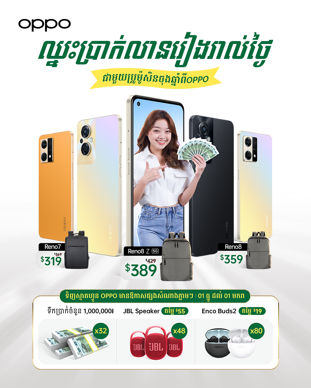 – ទិញ OPPO Reno8 តម្លៃ $359 ថែមជូន៖ កាតាបស្ពាយ (តម្លៃ $19) និងស៊ីមស្មាតលេខធម្មតាភ្ជាប់គម្រោង SurfLikeCrazy រយៈពេល 4ខែ