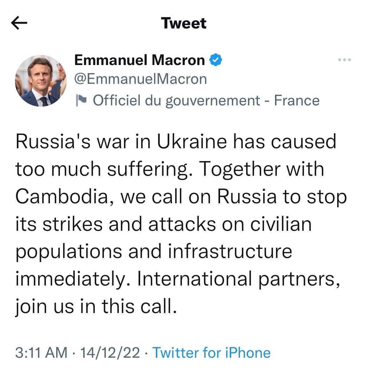 តាមរយៈបណ្តាញសង្គម Twiter លោក ម៉ាក្រុង បានលើកឡើងដូច្នេះថា៖ «សង្រ្គាមរបស់រុស្ស៉ីនៅក្នុងប្រទេសអ៊ុយក្រែន បានបង្កការឈឺចាប់យ៉ាងសម្បើម។ រួមជាមួយប្រទេសកម្ពុជា យើងអំពាវនាវឱ្យរុស្ស៉ីបញ្ឈប់ការវាយប្រហារតាម ផ្លូវអាកាសរបស់ខ្លួន និងការវាយប្រហារលើប្រជាជនស៊ីវិល ព្រមទាំងហេដ្ឋារចនាសម្ព័ន្ធនានាជាបន្ទាន់។ ប្រទេសដៃគូអន្តរជាតិ ក៏បានចូលរួមជាមួយពួកយើង ដើម្បី អំពាវនាវដូចគ្នានេះដែរ»។