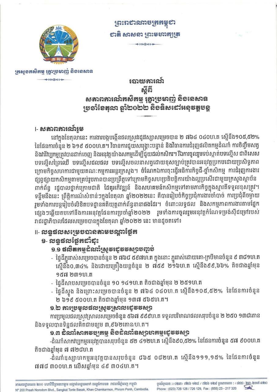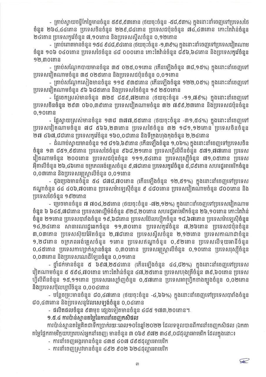 របាយការណ៍របស់ក្រសួងកសិកម្ម ស្ដីពី សភាពការណ៍កសិកម្ម ប្រចាំខែតុលា ឆ្នាំ២០២២ និងទិសដៅអនុវត្ដបន្ដ បានគូសបញ្ជាក់ថា ការប៉ាន់ស្មានតម្លៃគិតជាទឹកប្រាក់ រយៈពេល១០ខែ ឆ្នាំ២០២២ ដែលទទួលបានពីការនាំចេញកសិផល (ឯកតាតម្លៃផ្អែកតាមវិក្កយបត្ររបស់អ្នកនាំចេញ) មានចំនួន ៣ ០៦៩ ៩៧២ ៣៤៩ដុល្លារអាមេរិក ដែលក្នុងនោះ៖