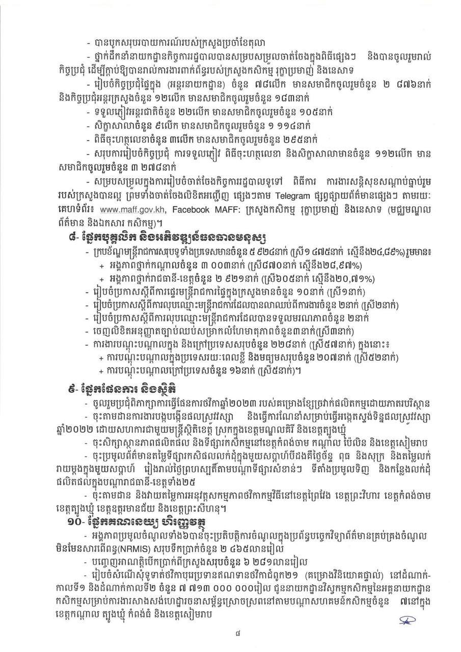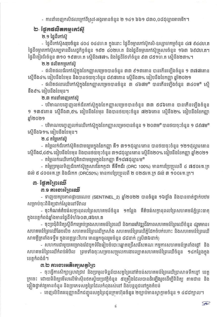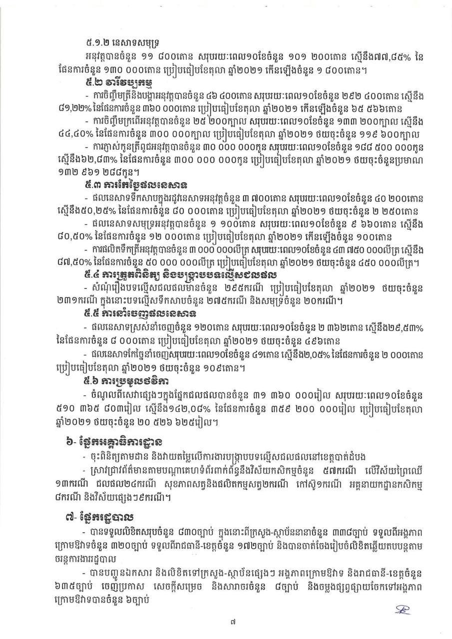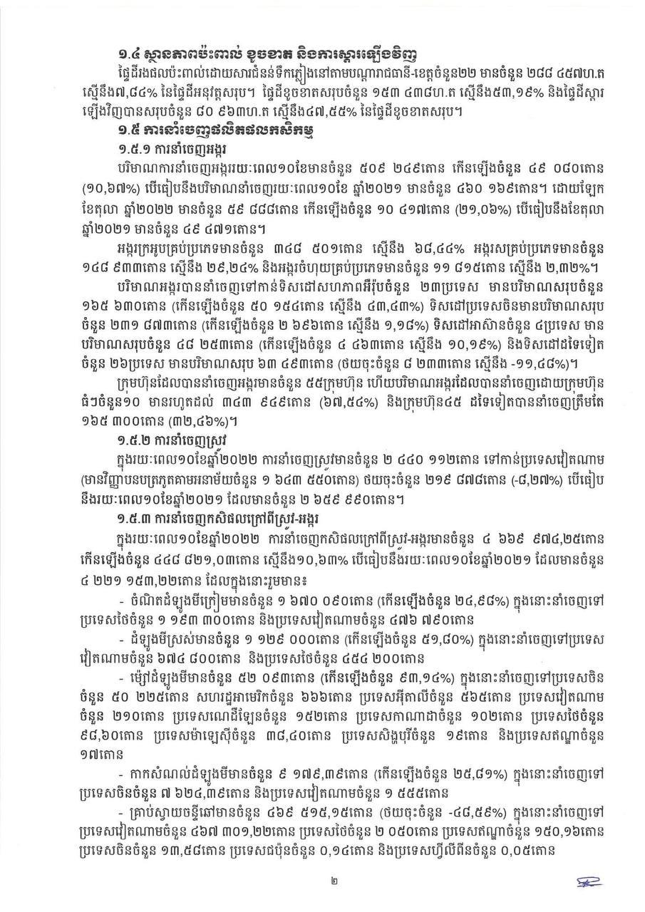 * ការនាំចេញកសិផលក្រៅពីស្រូវ-អង្ករមានបរិមាណ ៤ ៦៦៩ ៩៧៤តោន កើនឡើងចំនួន ៤៤៨ ៨២១តោន (១០.៦៣%) មានទឹកប្រាក់ ២ ១៤១ ៦៦១ ៨៣០ដុល្លារ។