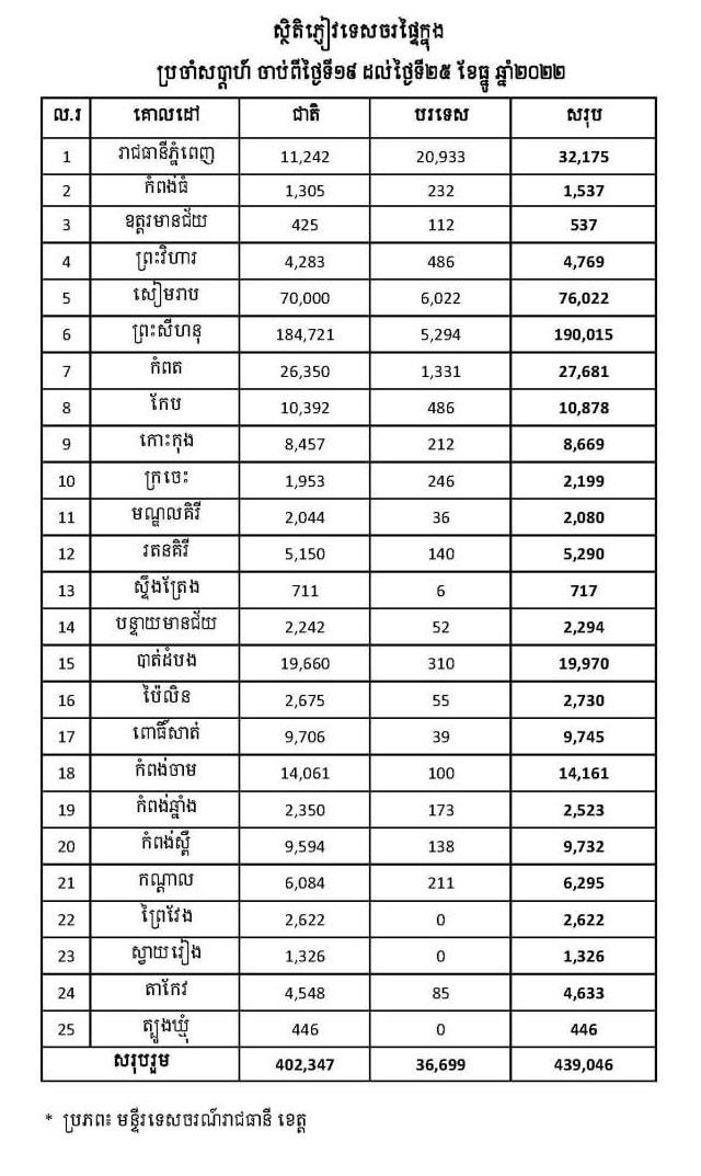 (ភ្នំពេញ)៖ លោក ថោង ខុន រដ្ឋមន្ត្រីក្រសួងទេសចរណ៍ បានបញ្ជាក់ថា ចាប់ពីថ្ងៃទី១៩-២៥ ខែធ្នូ ឆ្នាំ២០២២ នៅទូទាំងប្រទេសទទួលបានភ្ញៀវទេសចរសរុបមានចំនួន៤៣៩,០៤៦នាក់ ក្នុងនោះភ្ញៀវជាតិមាន៤០២,៣៤៧នាក់ និងភ្ញៀវបរទេសមាន៣៦,៦៩៩នាក់។