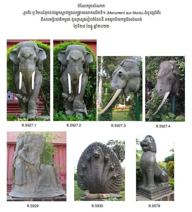 ជាក់ស្តែង កាលពីថ្ងៃទី២៥ ខែធ្នូ ឆ្នាំ២០២២ នៅសារមន្ទីរជាតិ មានការប្រគល់-ទទួល រូបសំណាក «រូបពីរ ឬ វិមានរំឰកដល់អ្នកស្លាប់ក្នុងសង្គ្រាមលោកលើកទី១» ដែលនៅសេសសល់ពីការបំផ្លាញក្នុងរបបកម្ពុជាប្រជាធិបតេយ្យ ចំនួន ៧វត្ថុ ធ្វើពីលោហធាតុពីសារមន្ទីរជាតិ ជូនក្រសួងរៀបចំដែនដី នគរូបនីយកម្ម និងសំណង់ ដើម្បីផ្គុំ និងសាងសង់ស្ដូបអនុស្សាវរីយ៍មិត្តភាពកម្ពុជា-បារាំងឡើងវិញ។