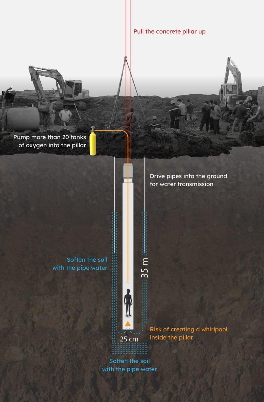 គួរបញ្ជាក់ថា នាពេលនេះ អាជ្ញាធរមិនអាចដឹងច្បាស់ ពីស្ថានភាពរបស់ក្មេងប្រុសខាងលើនៅឡើយទេ ប៉ុន្តែពួកគេកំពុងបន្តខំប្រឹង​ឱ្យអស់ពីលទ្ធភាព ហើយឧស្ម័នអុកស៉ីសែន ត្រូវបានបញ្ជូនចូលទៅក្នុងសសរជាប់រហូត។ យោងតាមប្រព័ន្ធផ្សព្វផ្សាយវៀតណាម ក្រុមសង្រ្គោះបានព្យាយាមប្រើប្រាស់ ឧបករណ៍ខួងដើម្បីបន្ទន់សាច់ដីនៅជុំវិញ ក្រោមគោលបំណងអាចទាញសសរស៉ីម៉ង់នោះឡើងមក ដើម្បីជួយក្មេងប្រុស ណាំ៕ ផ្តល់សិទ្ធិដោយ៖ freshnews
